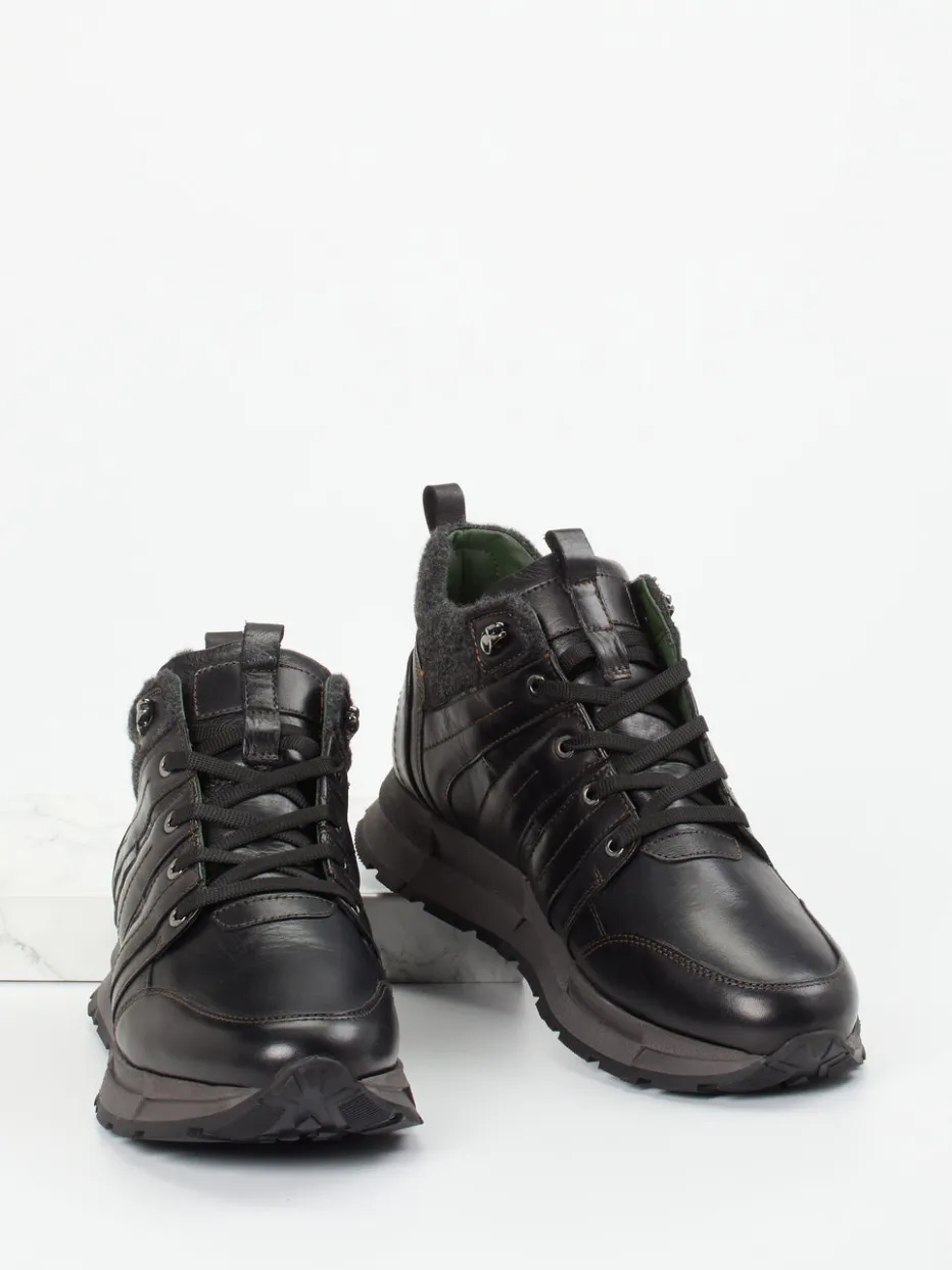 Robust trifft Komfort für den aktiven Alltag.Galizio Torresi präsentiert mit diesen knöchelhohen Herren-Stiefeletten einen Outdoor-inspirierten Sneakerboot. Dank des dunklen Kalbleders mit matter Oberfläche und Kontrastnähten überzeugt der Schuh mit einem urbanen Utility-Look. Ein gepolsterter Filzkragen in Dunkelolivgrün setzt einen warmen Akzent und sorgt gemeinsam mit dem komfortablen Kalblederfutter für angenehme Trageeigenschaften. Die breite Schnürung mit silberfarbenen Metallösen sichert den Halt, während die kräftige Gummiprofilsohle hohe Trittsicherheit im Gelände bietet. Ideal kombinierbar mit Thermohosen und Outdoorjacken. Ein funktionaler Freizeitbegleiter mit sportiver Silhouette und stilvollem Detailreichtum.