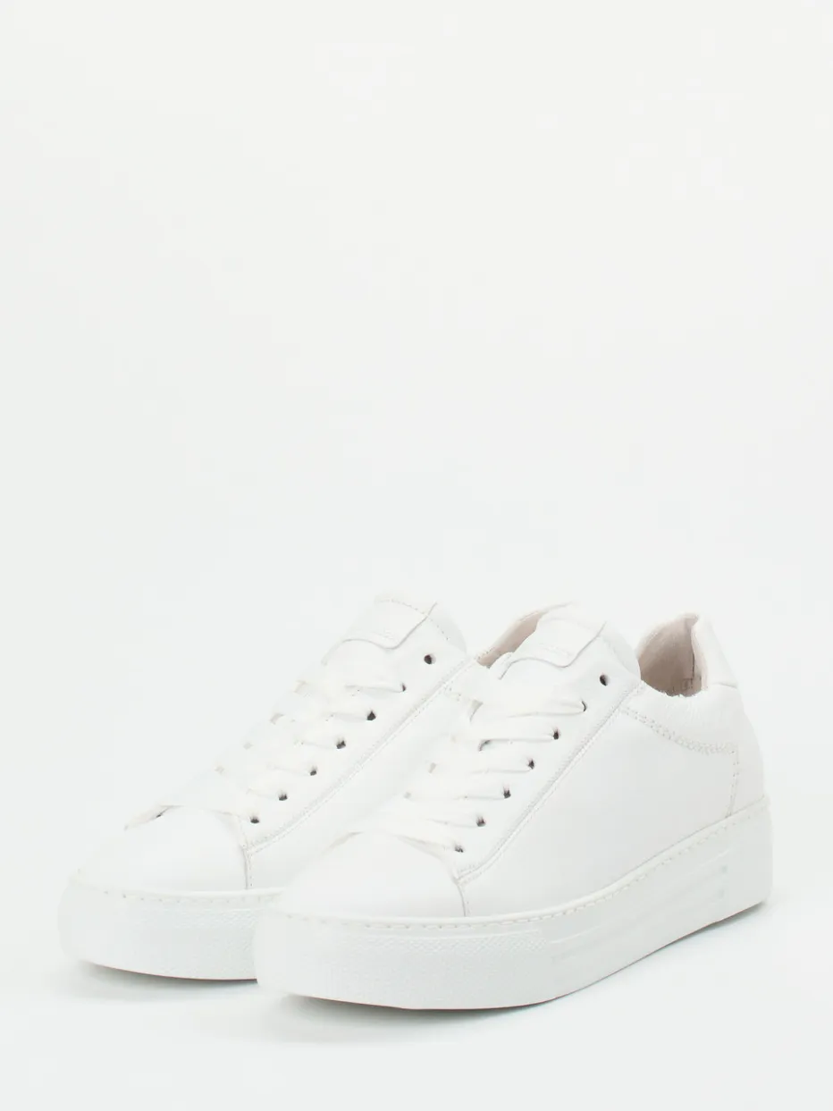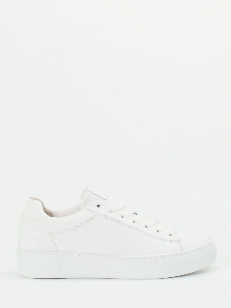 Feminin zeigt sich dieser Sneaker der Marke Gabor Comfort in der Weite G und Form Cervo. Das weiße Kalbleder ist weich verarbeitet. Stilvoll abgerundet wird der Schuh durch die tonige Schnürung. Die Gummisohle macht den monochromatischen Look perfekt, ist dabei rutschhemmend profiliert und federt jeden Schritt ab. Zusätzlichen Komfort bietet das gepolsterte, austauschbare Fußbett. Ein perfekter Alltagsbegleiter für den Frühling, der gute Laune macht!