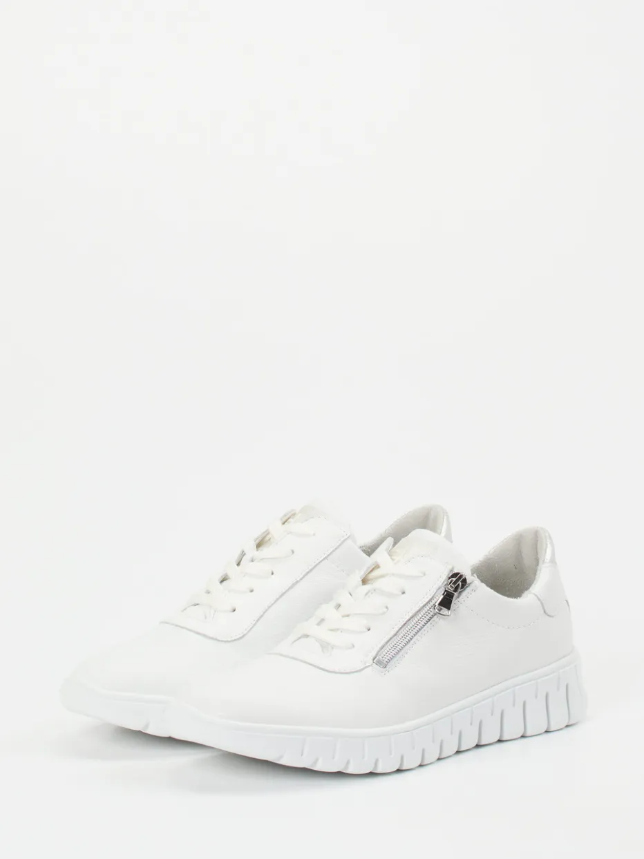 Modisch präsentiert die Marke Waldläufer diesen Sneaker in der Form Birdy mit der Weite H. Das weiße Kalbleder wirkt durch die natürliche Narbung besonders sportiv. Ist die tonige Schnürung einmal individuell eingestellt, hilft der seitliche Reißverschluss beim einfachen Ein- und Ausstieg. Die wunderbar weiche Innenpolsterung, das saugfähige Frottee und das gepolsterte Wechselfußbett versprechen besten Tragekomfort. Die gut profilierte, angenehm leichte EVA-Sohle sorgt für Trittsicherheit.