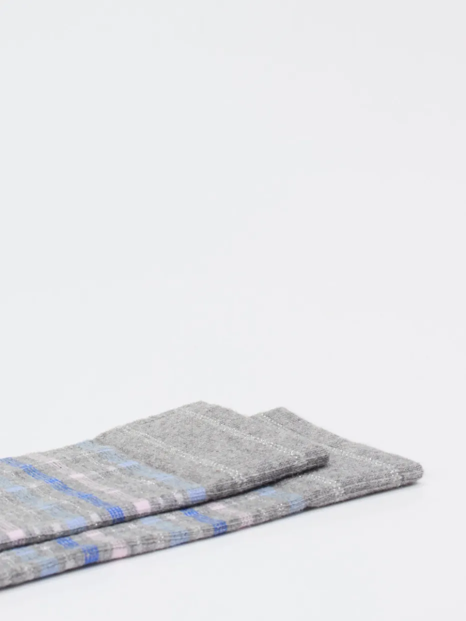 Das klassische Karomuster in Pastelltönen und ein dezent eingearbeiteter Glanzfaden verleihen dieser Socke subtile Eleganz mit moderner Note.