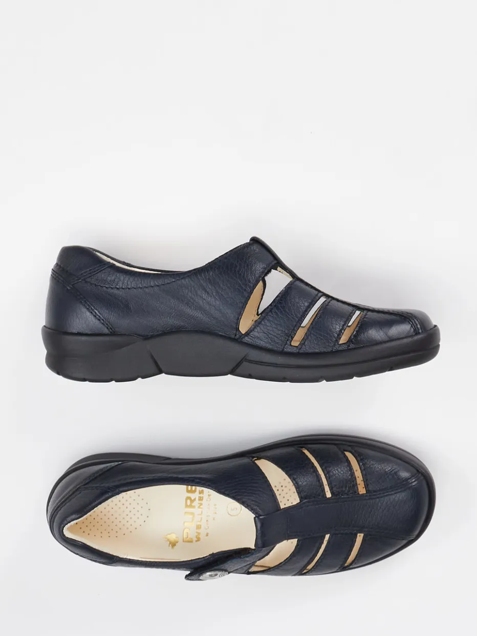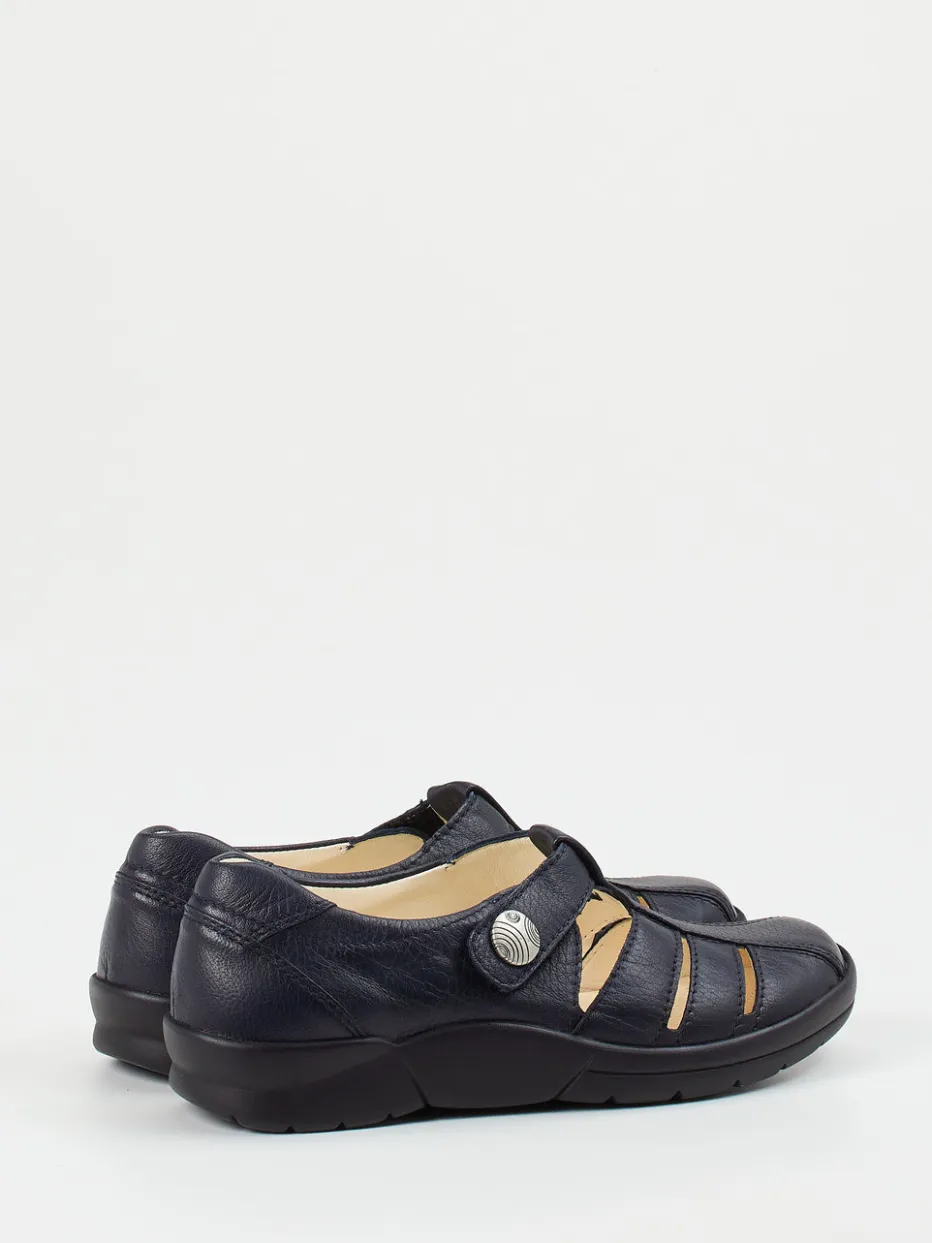 Ein ergonomisches Fußbett, atmungsaktive Cut-Outs und eine stoßdämpfende Gummisohle bieten Tragekomfort selbst an langen Tagen. Das dunkelblaue, genarbte Kalbleder wird durch ein helles Innenfutter in Beige kontrastierend akzentuiert. Ein dekorativer Zierknopf in Silberoptik schmückt den praktischen Klettverschluss auf dem Riemen. Die geschlossene Ferse und abgerundete Silhouette sorgen für Stabilität und eine angenehme Passform. Inspirierendes Design für die Trendlinie „Quiet Comfort SS24“. Kombiniert mit Komforthosen entsteht ein stimmiges Freizeit-Outfit.