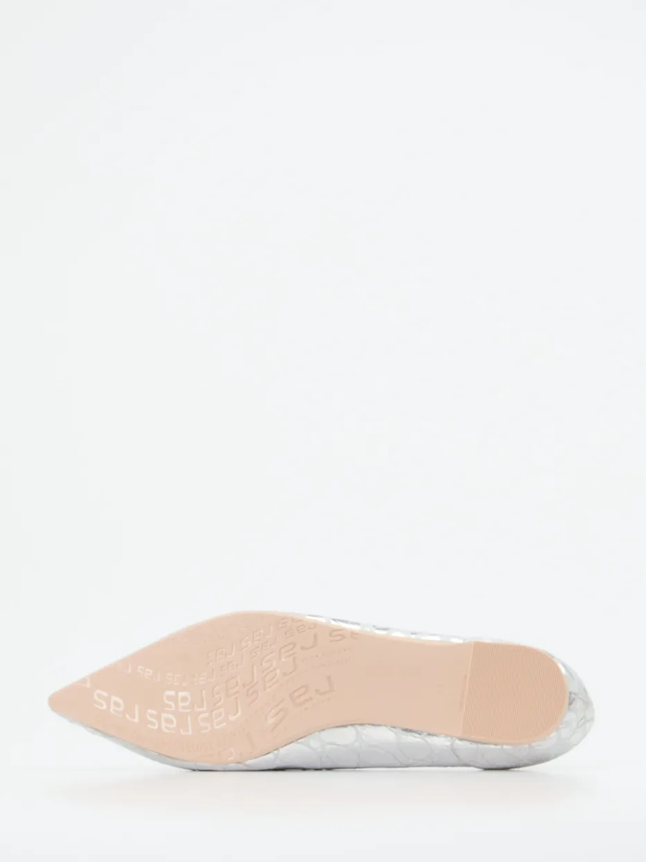 Spitz und glänzend ins Rampenlicht: Diese glamourösen Ballerinas von RAS leben von ihrer metallischen Krokoprägung und einer kristallbesetzten Agraffe.