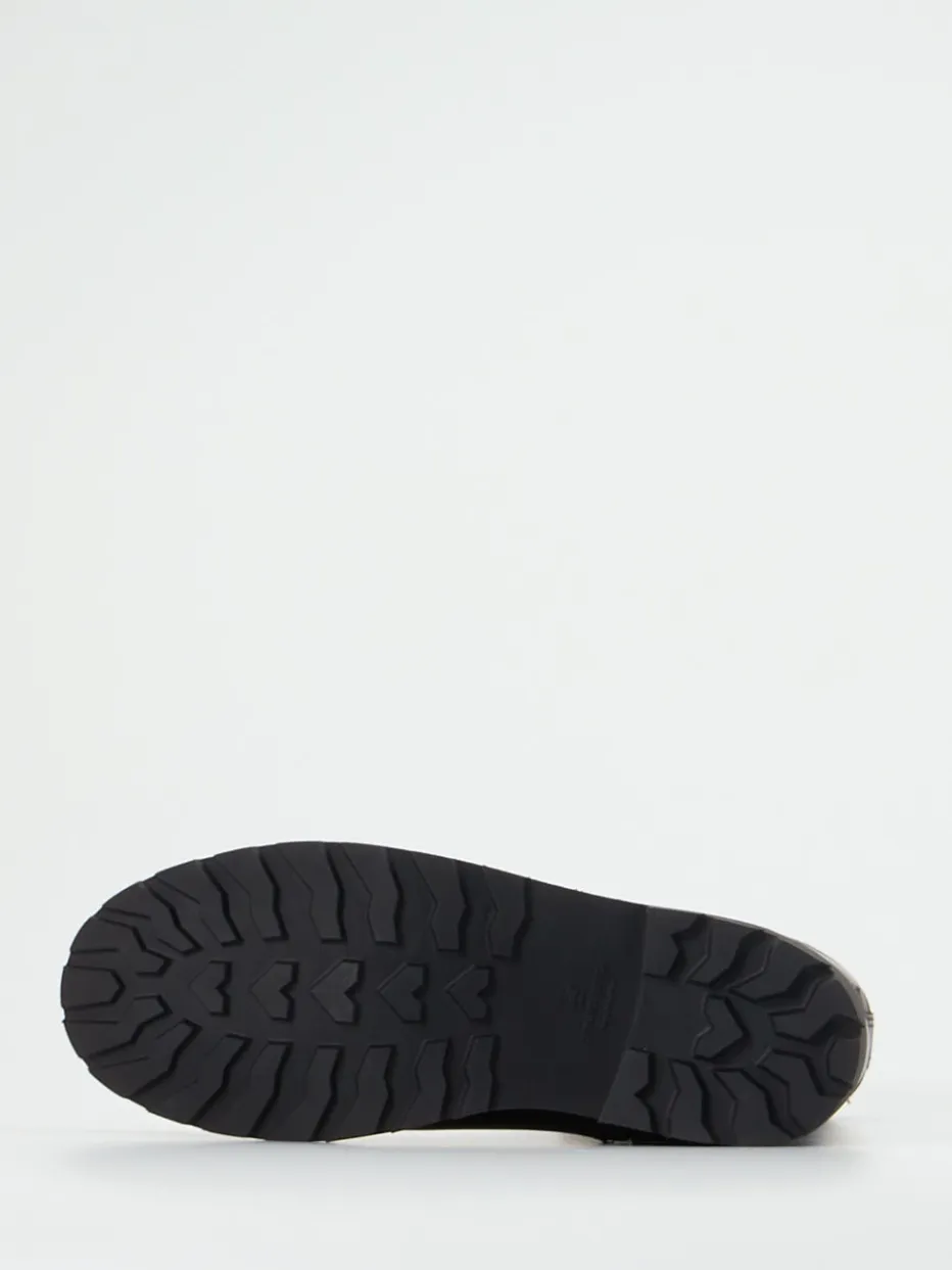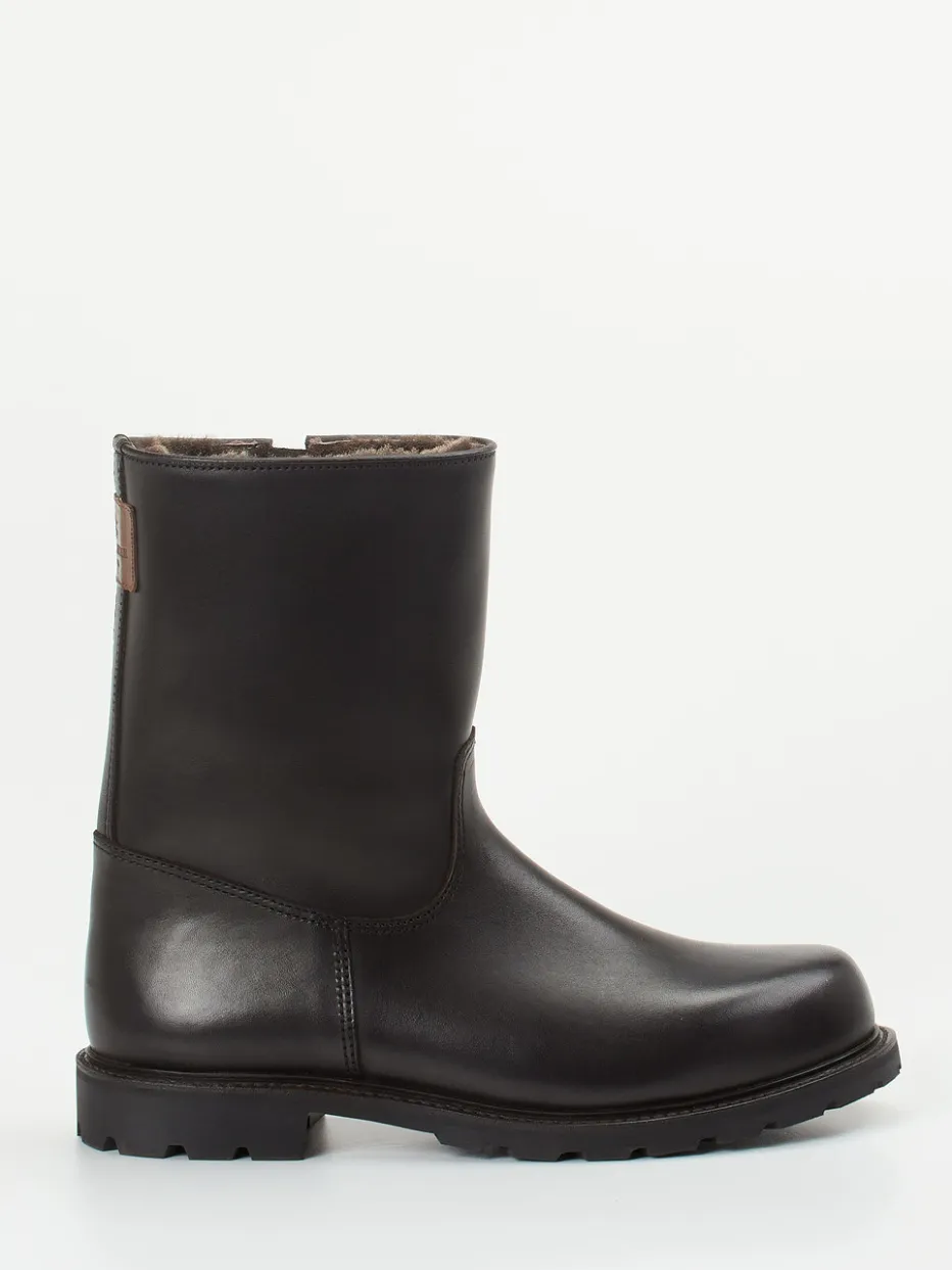 Wenn Kälte und Nässe dominieren, überzeugt dieses Modell mit wetterfestem Fettleder, matt samtiger Oberfläche und flauschigem Lammfellfutter. Der tiefe Braunton unterstreicht die klare Silhouette mit geradem Schaft und tonigem Reißverschluss an der Innenseite. Die profilierte Gummisohle sorgt für stabilen Halt auf winterlichen Untergründen. Abgerundet wird das Design durch feine Ton-in-Ton-Nähte und ein geprägtes Markenlogo am Hinterriemen. Im Stil zwischen Workwear und dezentem Luxus positioniert, lässt sich der Stiefel vielseitig zu Wollmantel oder Denim kombinieren.