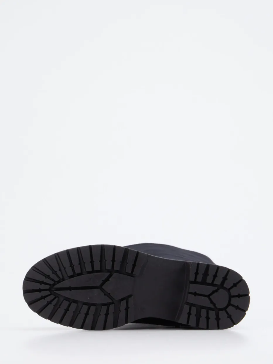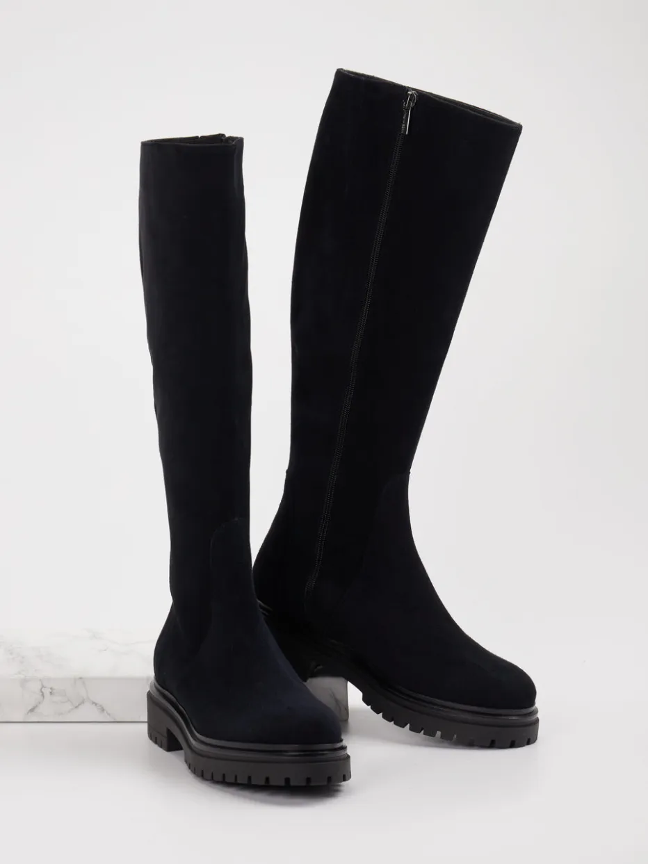 Geradliniges Design, schwarzes Veloursleder und eine robuste Profilsohle machen diesen kniehohen Stiefel zu einem urbanen Essential der neuen Saison.