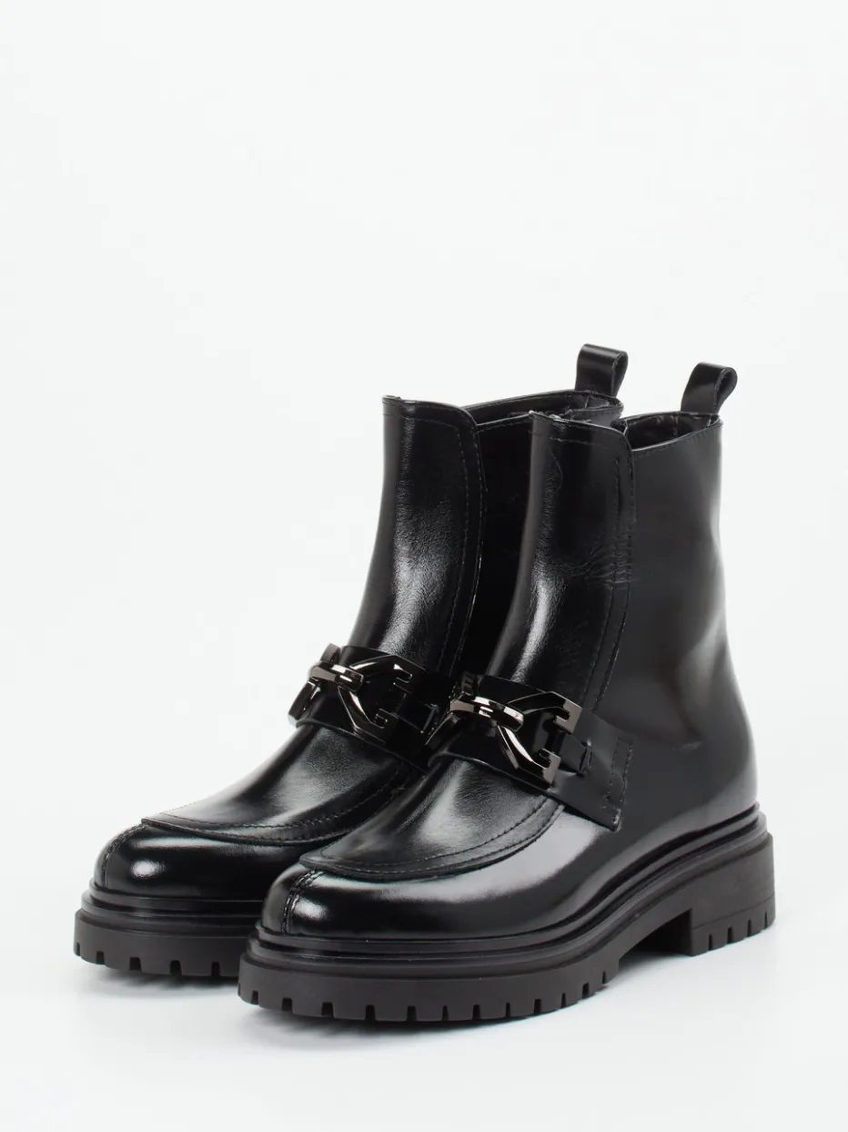 Diese Stiefelette kombiniert glänzendes Lackleder mit einer robusten Profilsohle – perfekt für stilvolle Auftritte mit urbanem Charakter.