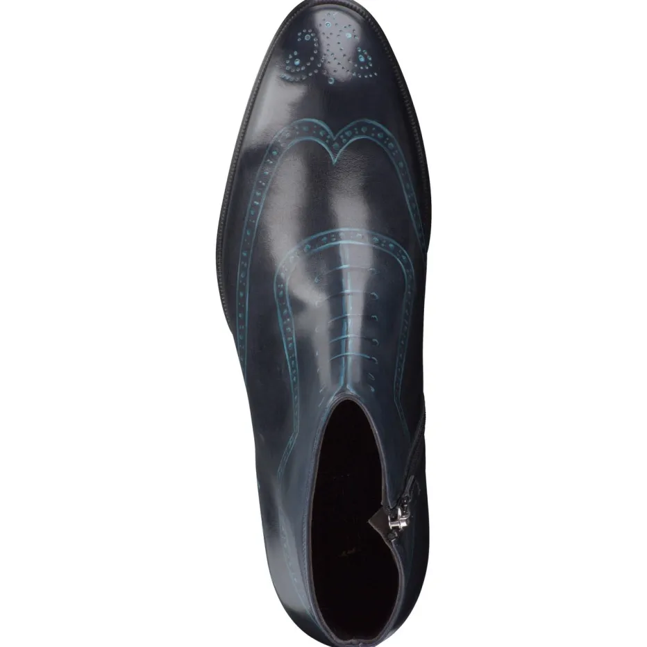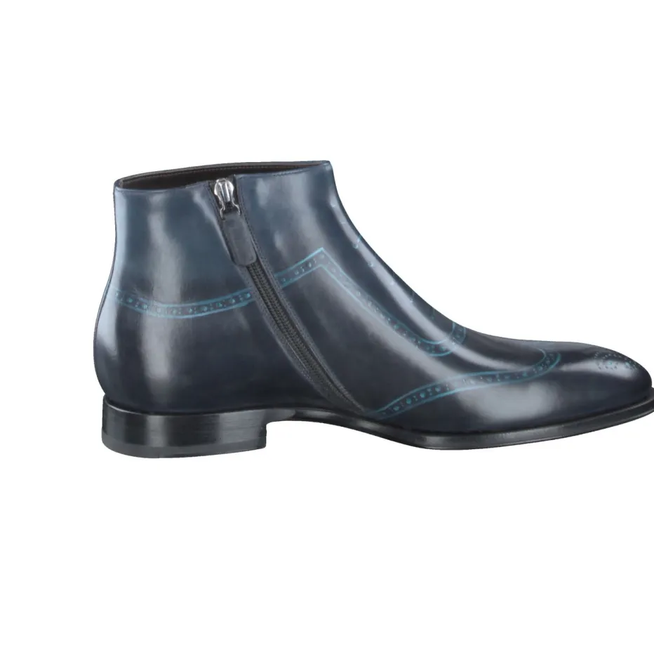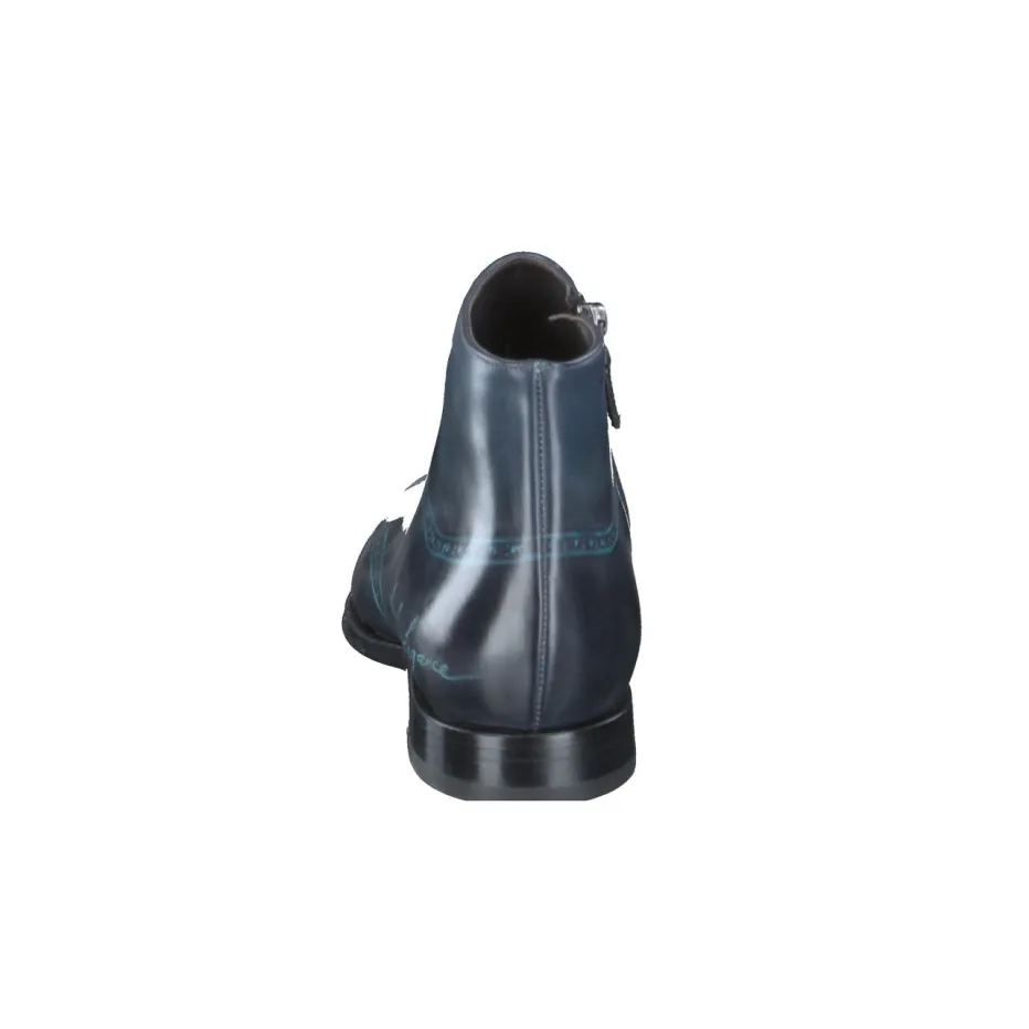 Exzellenz in jedem Pinselstrich.Franceschetti präsentiert eine Herren-Stiefelette, die traditionelle Eleganz neu interpretiert. Für den Einsatz bei formellen Anlässen oder als stilvolles Business-Statement überzeugt das Modell durch feines, glänzendes Kalbleder in tiefem Blau mit handbemalten türkisfarbenen Akzenten. Prägnant sind die dekorativen Linienprägungen und der auffällige Schriftzug „timeless elegance“. Die schmale, spitz zulaufende Silhouette wirkt besonders edel, ein seitlicher Reißverschluss vereinfacht den Einstieg. Die Ledersohle mit Gravur rundet das exklusive Design handwerklich ab und verleiht dem Schuh seinen limitierten Charakter. Ein ausdrucksstarker Begleiter für den anspruchsvollen Auftritt mit italienischem Understatement.