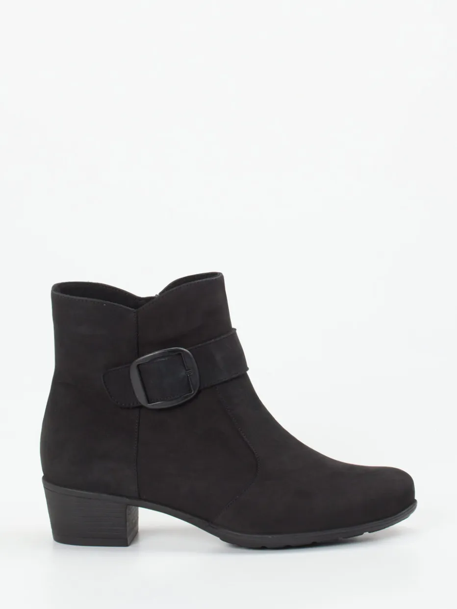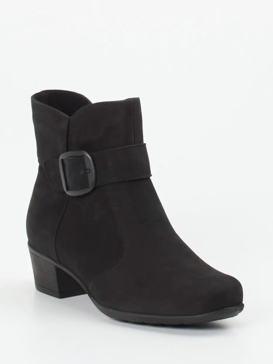 Dezente Details, maximaler Komfort.Solidus präsentiert mit dieser Stiefelette ein Modell, das durch reduzierte Linien und hochwertige Materialien überzeugt. Ideal für den Übergang im Büroalltag oder leger kombiniert in der Freizeit: Das schwarze Nubukleder ist samtig angeschliffen und erhält durch tonige Overlays sowie eine dekorative Schnalle eine subtile Struktur. Die klassische, knöchelhohe Form wird durch einen komfortablen Blockabsatz ergänzt. Der seitliche Reißverschluss erleichtert den Einstieg, während die profilierte Gummisohle Trittsicherheit bietet. Das textile Innenfutter aus Baumwolle sorgt für ein angenehmes Fußklima. Styling-Tipp: Funktioniert ideal zu dunklen Strumpfhosen und minimalistischen Outfits. Solidus steht hier für bequeme Eleganz in langlebiger Verarbeitung.