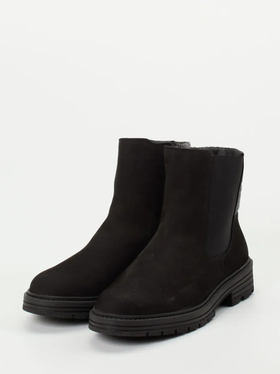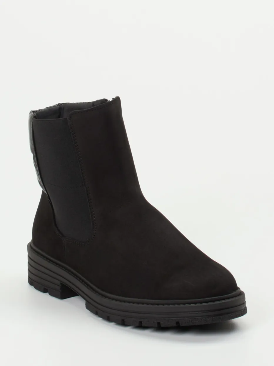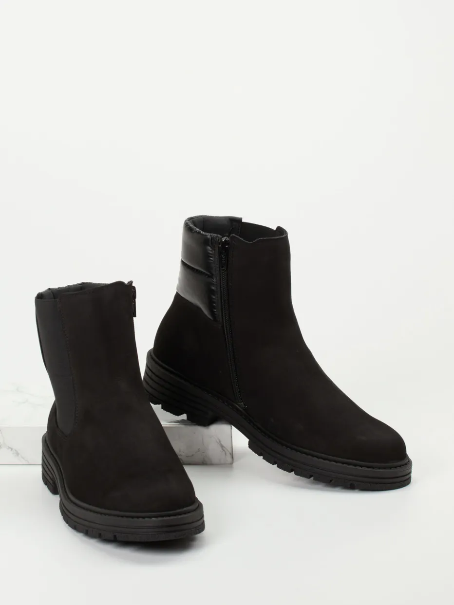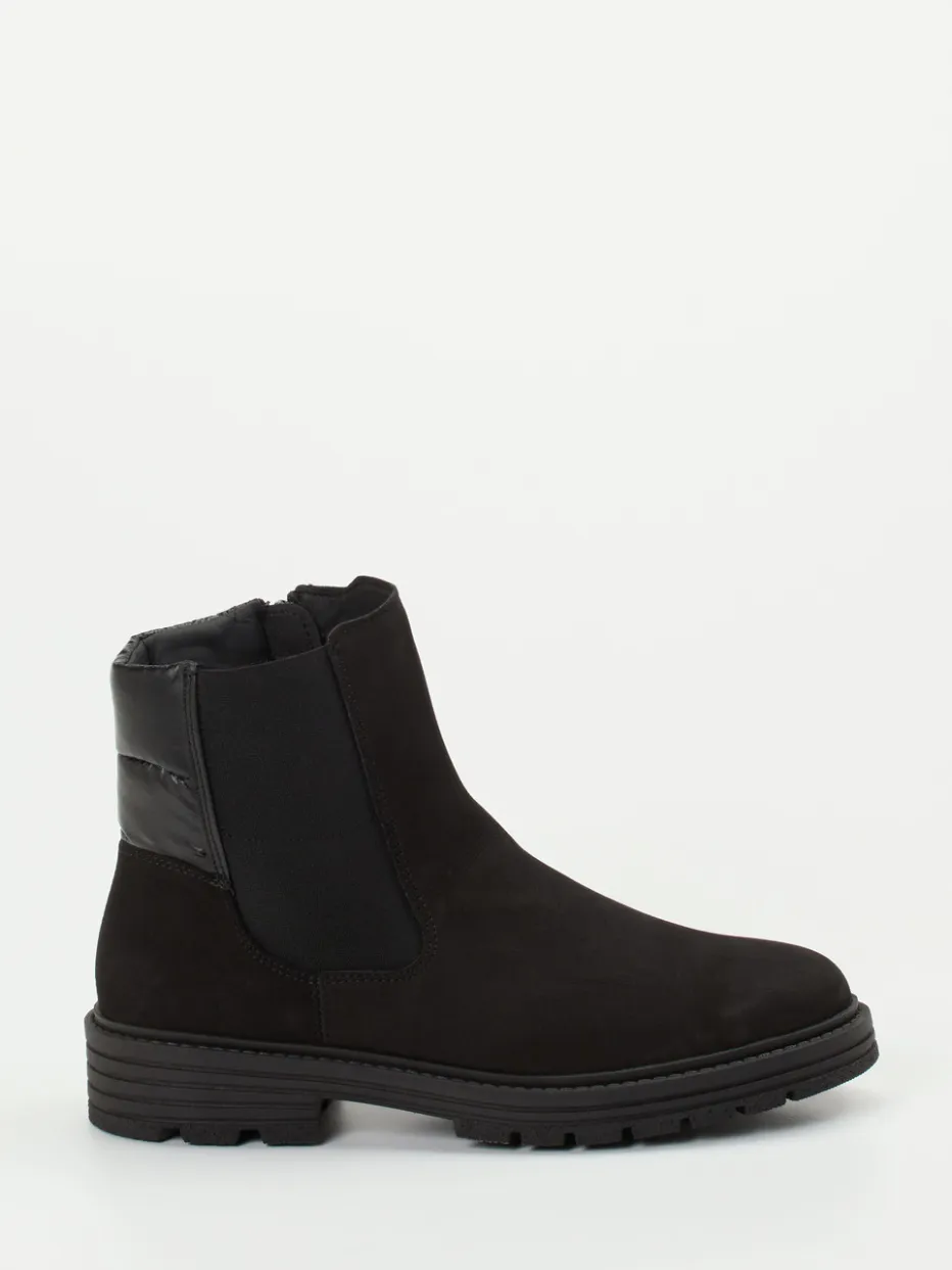 Wärmender Minimalismus für kalte Tage.Die Marke Solidus präsentiert eine bequeme Damen-Stiefelette im Chelsea-Stil. Gefertigt aus schwarzem Nubukleder mit samtiger Oberfläche, ergänzt durch gesteppte Textilpartien am Schaft, überzeugt dieses Modell in klarer, knöchelhoher Form. Die elastische Seitenpartie sowie der Innenreißverschluss garantieren einen angenehmen Einstieg. Warm gefüttert mit Microfaser und ausgestattet mit herausnehmbarem Luftpolsterfußbett bietet der Schuh höchsten Tragekomfort. Die rutschfeste Gummisohle mit Profil unterstreicht den funktionellen Anspruch – perfekt für Alltag oder Spaziergänge bei kühlem Wetter. Der Look bleibt dabei schlicht und kombinationsfreundlich im Streetwear-Kontext. Solidus steht hier für Komfort mit funktionalem, modernem Anspruch.