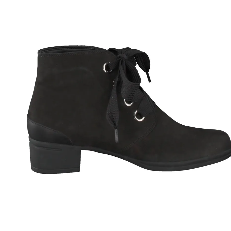 Komfort trifft auf urbanen Stil.Hartjes präsentiert mit dieser schwarzen Stiefelette einen vielseitigen Begleiter für den Alltag. Aus hochwertigem Nubukleder gefertigt und samtig angeschliffen, verleiht das matte Finish der knöchelhohen Silhouette eine zurückhaltend-edle Ausstrahlung. Breite Schnürbänder, silberfarbene Metallösen und eine verstärkte Fersenkappe setzen dezente Akzente. Die komfortable Weite H, ein herausnehmbares Fußbett sowie ein softer Textilfutter sorgen für angenehmes Tragen – auch im Büro. Der 3 cm hohe Blockabsatz und die rutschhemmende Gummisohle unterstreichen die alltagstaugliche Funktion. Ideal zu monochromen Looks kombinierbar. Reduktion und Qualität prägen den anspruchsvollen Hartjes-Komfort.