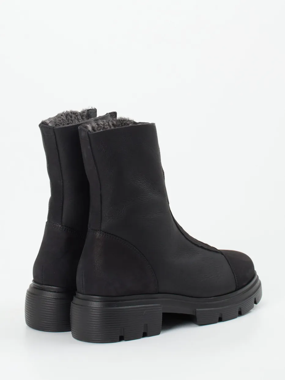 Diese Stiefelette vereint samtig angeschliffenes Nubukleder mit glattem Finish und wetterfester Funktion – ideal für den urbanen Winteralltag.