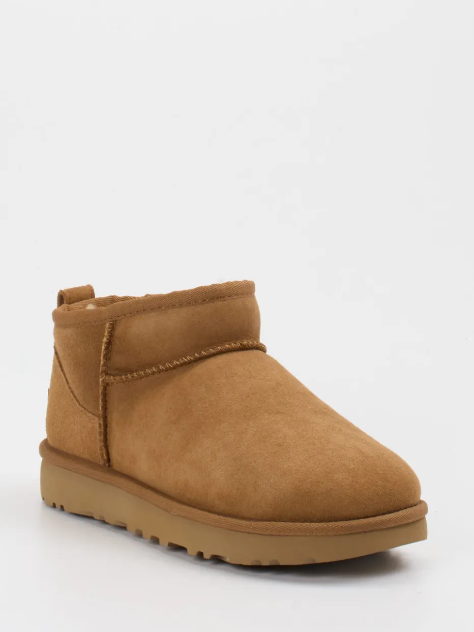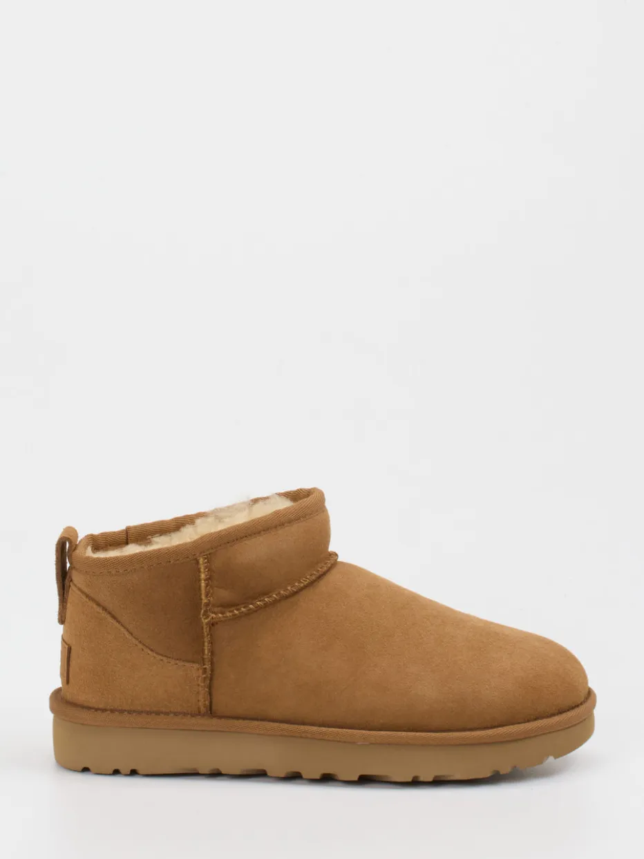 Die cognacbraune UGG-Stiefelette vereint minimalistisches Design mit einem warm gefütterten Innenleben – ein Balanceakt aus Komfort, Materialqualität und dezenter Modeaussage.