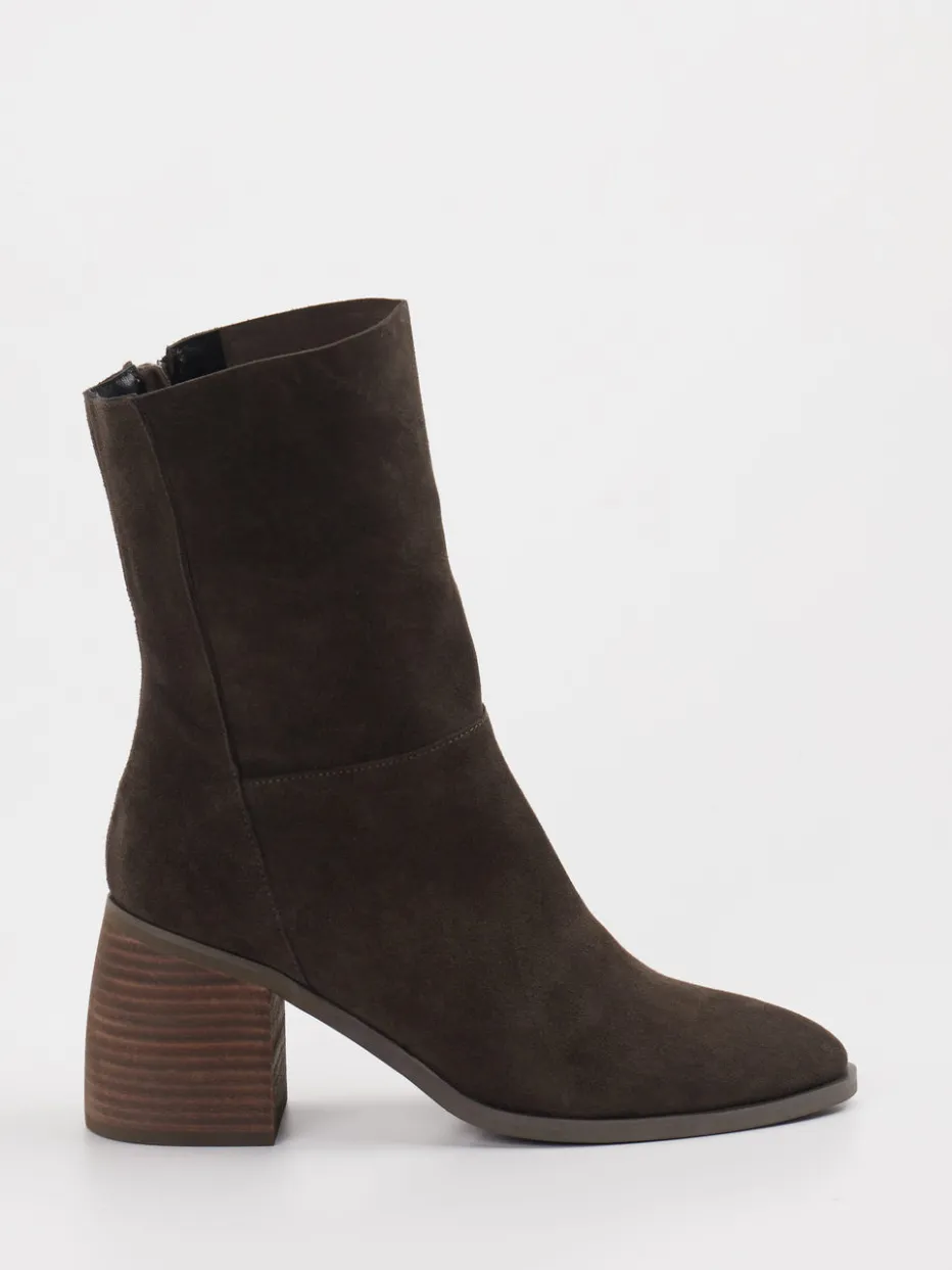 Understatement in eleganter Form. Gioia präsentiert eine klassische Damen-Stiefelette mit klarer Linie und feiner Oberfläche. Für Büro, Alltag oder stilvolle Freizeitmomente: Das Modell aus samtigem Veloursleder überzeugt durch seine tiefbraune Farbgebung, den geradlinigen Schaft und einen 6 cm hohen Blockabsatz in realistischer Holzoptik. Die glatte, matte Textur unterstreicht den betont minimalistischen Charakter, während ein rückseitiger Reißverschluss für komfortables Anziehen sorgt. Die hochwertige Kunststoffsohle rundet das Design funktional ab. Ästhetisch passend zur „Quiet Luxury“-Tonalität der Saison. Optimal zu Wollröcken oder hellen Kaschmirmänteln. Ein femininer Allrounder mit puristischer Eleganz von Gioia.