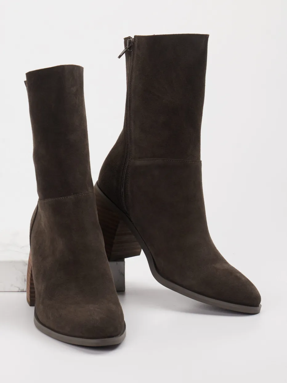 Der edelmatt schimmernde Veloursleder-Look und der komfortable Blockabsatz in Holzoptik machen diese Gioia-Stiefelette zum stilvollen Begleiter für minimalistische Herbst-Looks.