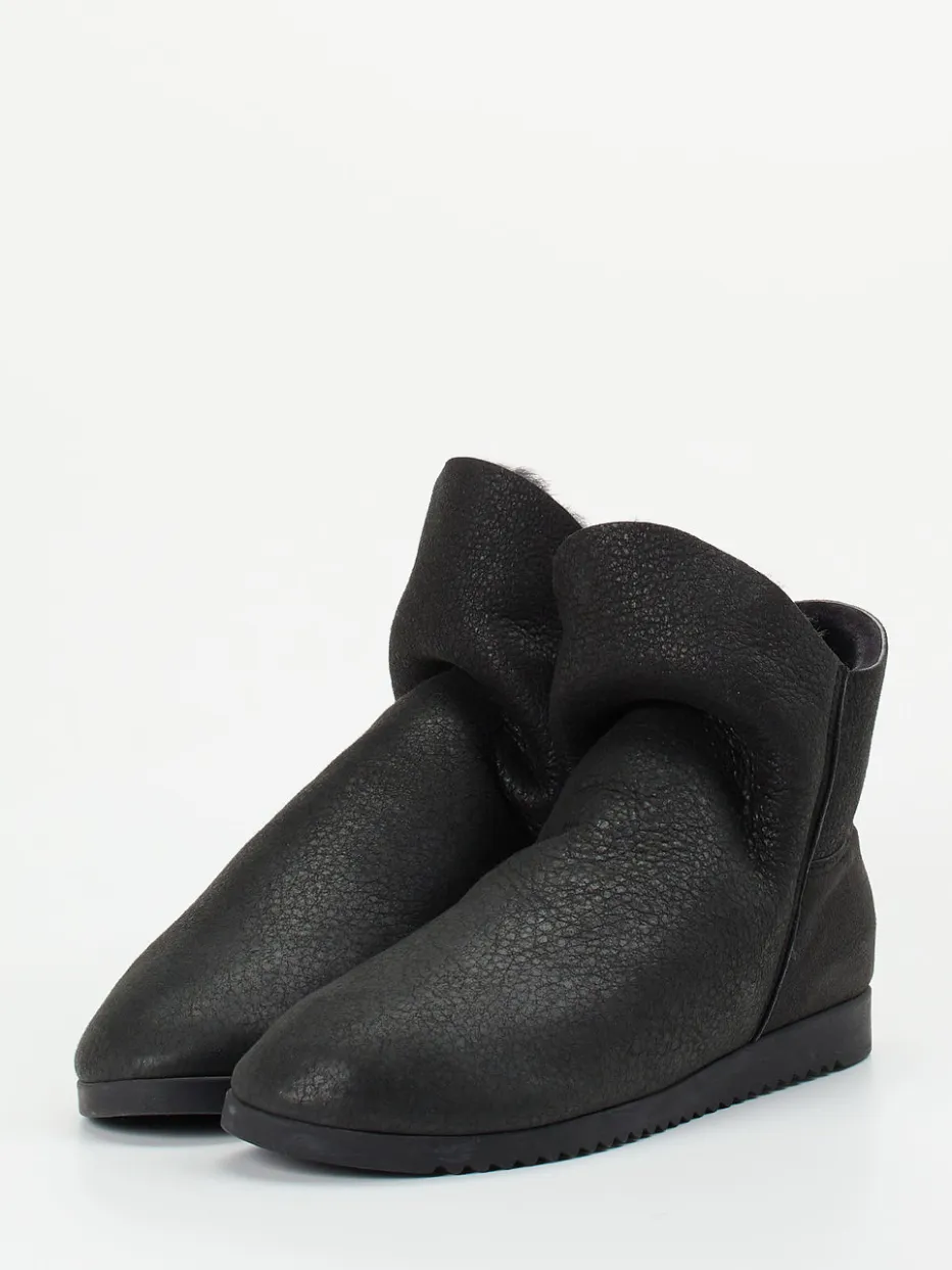 Die asymmetrische Schlupfform und das hochwertige Lammfellfutter bieten stilvollen Schutz vor Kälte. Die profilierte Naturlatexsohle sorgt für eine komfortable Alltagstauglichkeit.