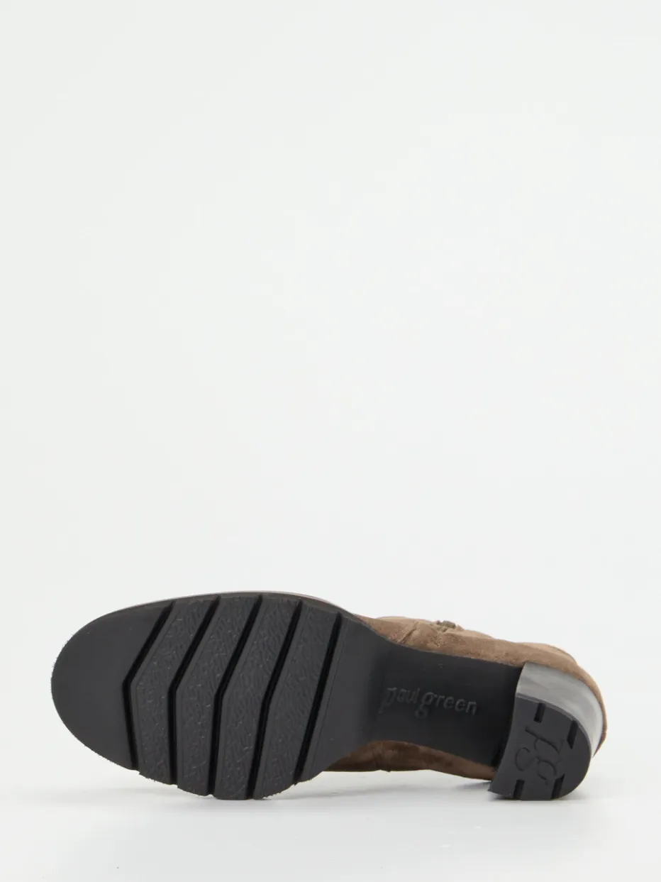 Minimal Chic auf höherem Niveau.Paul Green präsentiert mit dieser Damen-Stiefelette eine stilvolle Lösung für den Alltag zwischen Business und Freizeit. Das braune Veloursleder wirkt samtig-matt und liegt im Trend des Quiet Luxury. Form und Funktion treffen in der knöchelhohen, verschlankten Silhouette mit 7,5 cm Blockabsatz und markant profilierter Gummisohle aufeinander. Der seitliche Reißverschluss in Antikgold erleichtert das Anziehen, tonige Nähte und die klare Linie unterstreichen den urban-minimalistischen Look. Innen sorgt weiches Kalblederfutter für Komfort. Optimal kombinierbar mit Wollmantel oder Tailoring. Ein Modell mit stilsicherer Aussage und handwerklicher Qualität – typisch Paul Green.
