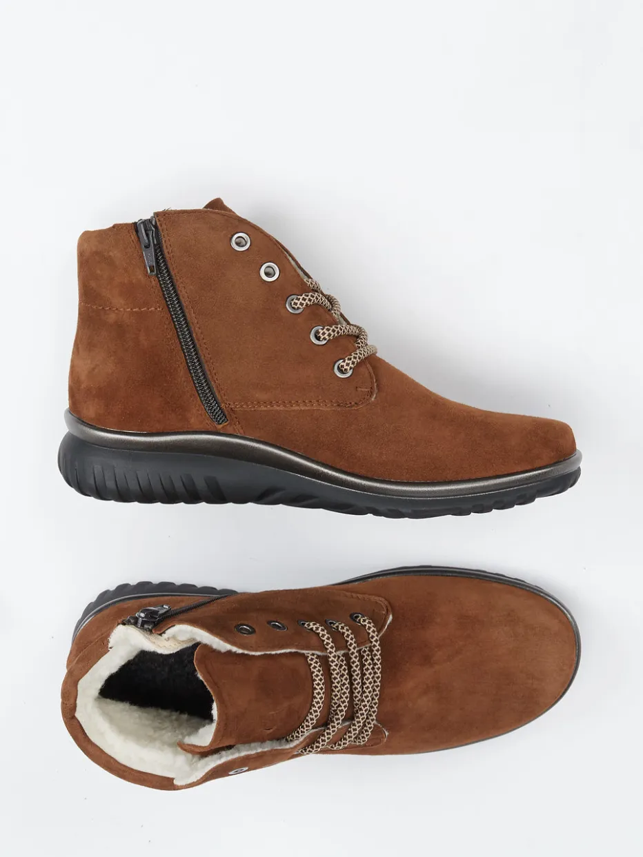 Warme Begleitung für kühle Tage.Die Marke Semler bringt mit dieser Stiefelette eine komfortorientierte Alltagsbegleiterin auf den Punkt. Ob beim Stadtbummel oder beim Spaziergang in der Natur – das weiche Veloursleder in Cognacbraun mit matter Oberfläche bietet dabei angenehme Wärme und stilvolle Zurückhaltung. Die knöchelhohe Form und die Kombination aus Reißverschluss und beige-brauner Kordelschnürung verbinden Funktionalität mit zeitgemäßem Minimalismus. Das warme Teddyfutter hält die Füße zuverlässig warm, während die PU-Profilsohle mit silberner Umrandung für Trittsicherheit sorgt. Dank herausnehmbarem Fußbett und Weite H steht maximaler Komfort im Fokus.
