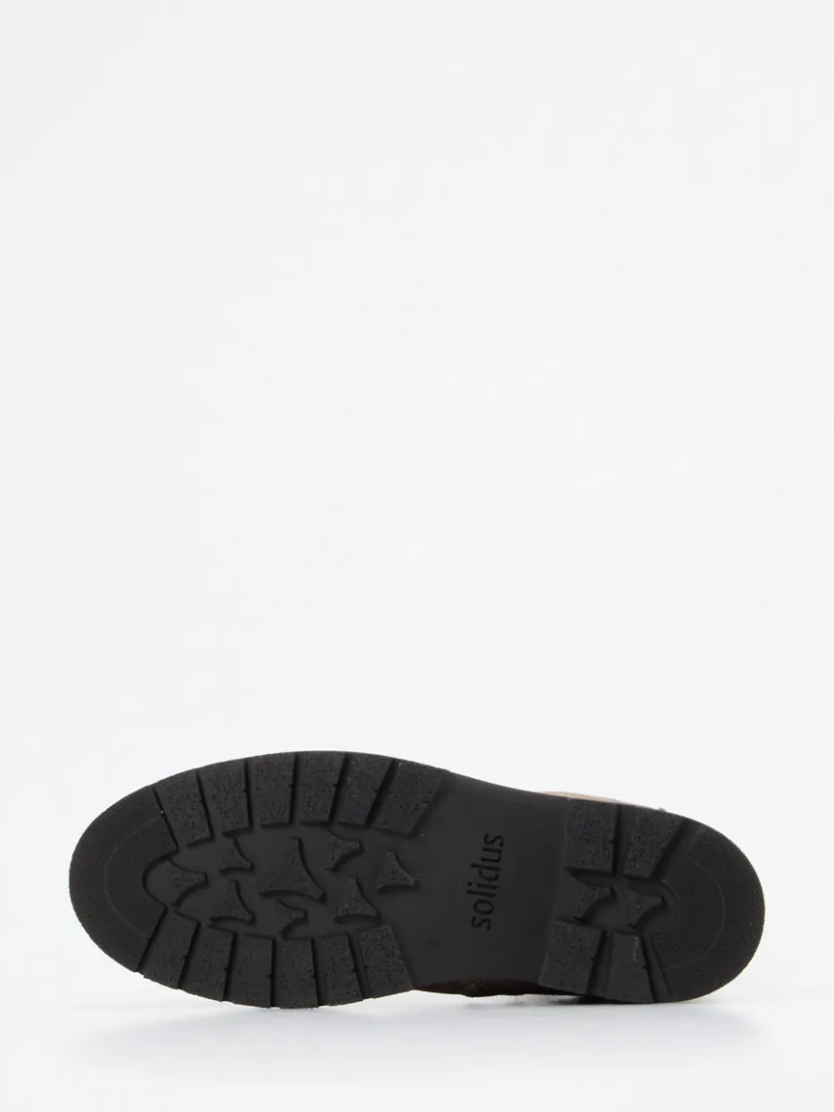 Wärmend und stilvoll durch den Winter.Solidus präsentiert eine komfortorientierte Damen-Stiefelette mit funktionaler Schnürung und seitlichem Reißverschluss. Ideal für kühle Tage in der Stadt oder auf winterlichen Spazierwegen: Das taupefarbene Veloursleder mit matter Oberfläche und tonalen Nähten zeigt sich im minimalistisch geprägten Utility-Look. Ein kuscheliges Innenfutter aus Wolle hält angenehm warm, während die profilierte Gummisohle mit 2 cm Laufhöhe sicheren Halt bietet. Das Modell passt zu casual Looks mit Steppmantel und Kaschmirmütze oder wärmenden Wollaccessoires. Ein durchdachter Alltagsbegleiter mit der bewährten Solidus-Komfortpassform.