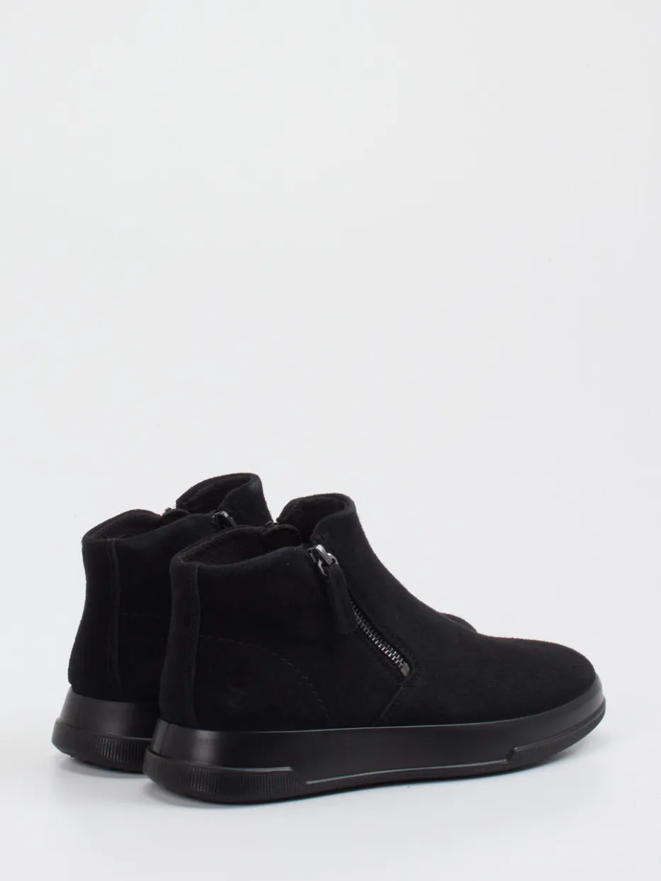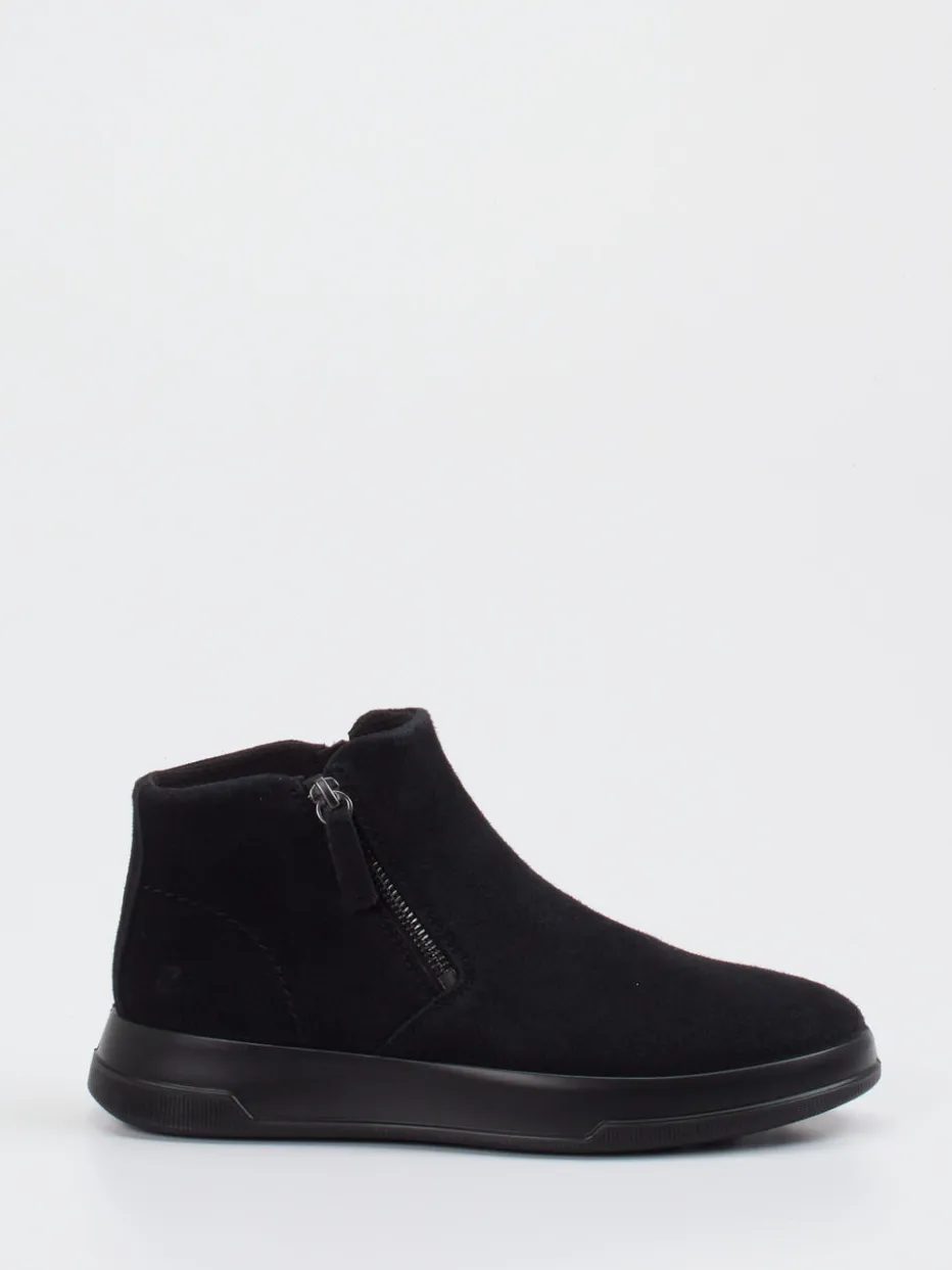 Puristische Eleganz trifft Komfort.Diese Damen-Stiefelette von Ecco vereint minimalistisches Design mit hohem Tragekomfort. Ob beim Stadtrundgang oder im entspannten Alltag – das samtige Veloursleder mit matter Oberfläche setzt in Schwarz ein stilvolles Statement. Der knöchelhohe Schaft mit dezenten Nähten, zwei tonigen Reißverschlüssen und gepolsterter Einstiegskante sorgt für optimalen Sitz und ein angenehmes Anziehen. Die flexible Gummisohle mit leichtem Grip-Profil unterstützt ein gutes Laufgefühl. Der Look orientiert sich am „Quiet Luxury“-Trend und passt zu schlicht gehaltenen Styles oder weichen Materialien wie Kaschmir. Ecco-typisch überzeugt die Stiefelette mit einem durchdachten Materialkonzept und zeitloser Alltagstauglichkeit.