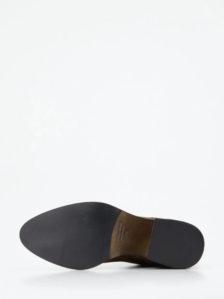 Perfekt für den Business-Alltag oder lässige Herbstspaziergänge: Das samtig angeschliffene Veloursleder zeigt sich in einem warmen Walnussbraun mit markantem Farbverlauf an Spitze und Ferse – ein dezenter Vintage-Akzent. Der rückseitige Reißverschluss in Gold erleichtert das An- und Ausziehen, während der stabile 5 cm hohe Blockabsatz in Holzoptik stilvolle Retro-Noten setzt. Die schmal zulaufende Silhouette unterstreicht den femininen Look und harmoniert besonders gut mit Kaschmirmantel oder Wollrock.