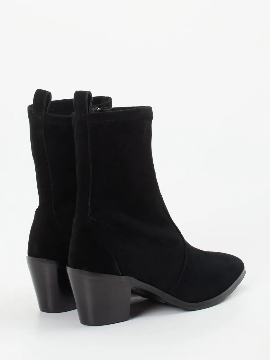 Western-Flair neu interpretiert.Maripé zeigt bei dieser Damen-Stiefelette, wie minimalistisch inszenierter Western-Style im Alltag funktioniert. Schwarzes, samtig angeschliffenes Veloursleder, eine leicht trichterförmige Form sowie der schmal zulaufende Leisten setzen modische Akzente. Der Ton-in-Ton gehaltene Reißverschluss an der Seite erleichtert den Einstieg, während die Kombination aus Leder- und Gummisohle sicheren Stand garantiert. Geprägt von Modern Western und Quiet Luxury ist dieses Modell ideal für herbstliche Outfits mit Jeans, Midikleid oder Lederrock. Zuglaschen am Schaft abonnieren den Cowboy-Charme ohne Kostümierung. Markentypische Eleganz, die Trendgespür mit Laufkomfort vereint.