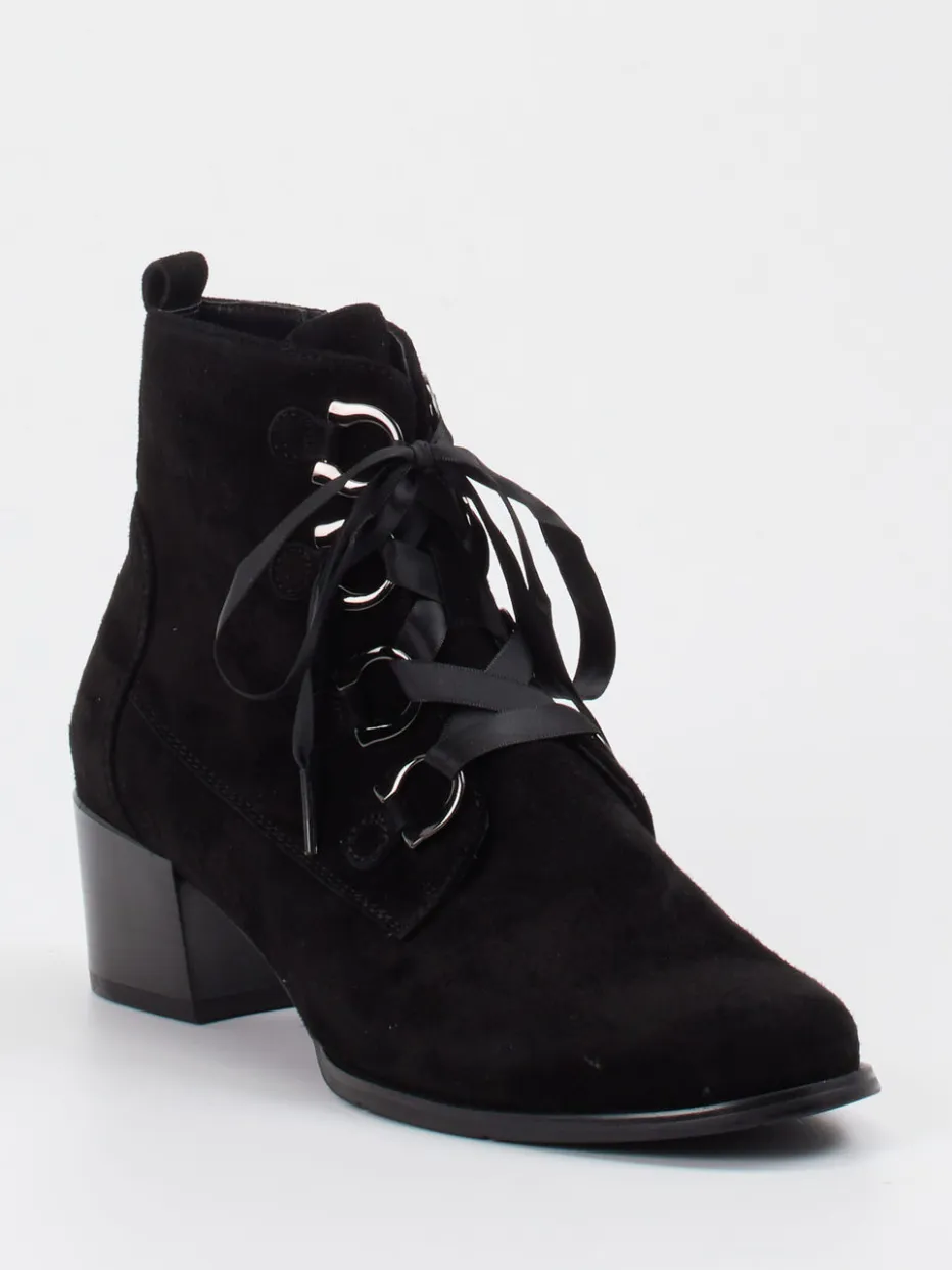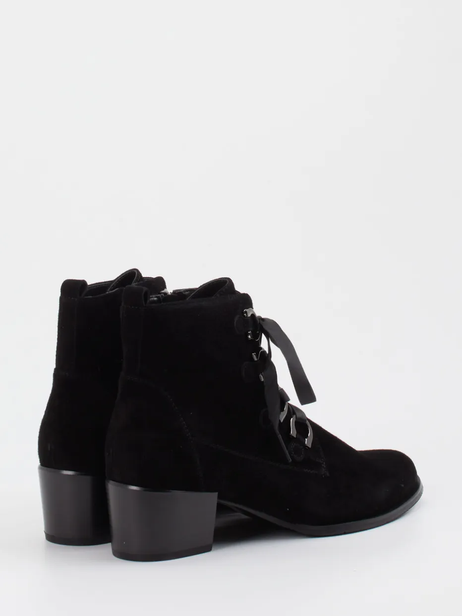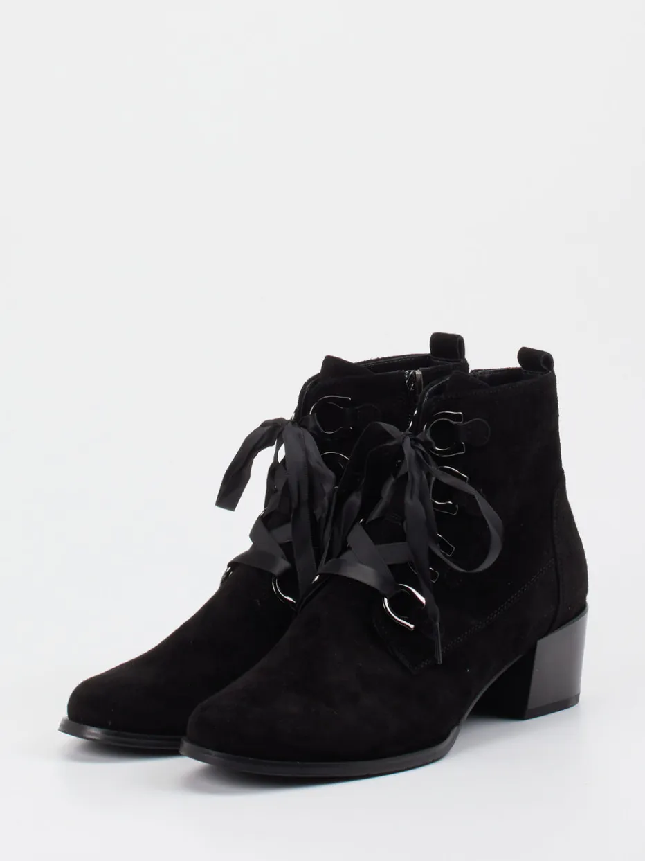 Die Stiefelette von Ralph Harrison verbindet klare Linien mit femininer Note. Ob Stadtspaziergang oder Abendessen, das weiche schwarze Veloursleder – samtig angeschliffen – sorgt für eleganten Komfort. Die Kombination aus Satin-Schnürung, silberfarbenen D-Ring-Ösen und seitlichem Reißverschluss setzt markante Akzente. Ein mittelhoher Blockabsatz sowie ein dunkelgraues Microfaserfutter unterstreichen den Qualitätsanspruch. Die knöchelhohe, leicht spitz zulaufende Form orientiert sich am minimalistischen Vintage-Revival aktueller Herbsttrends. Ideal zu Wollmantel oder Lederjacke.