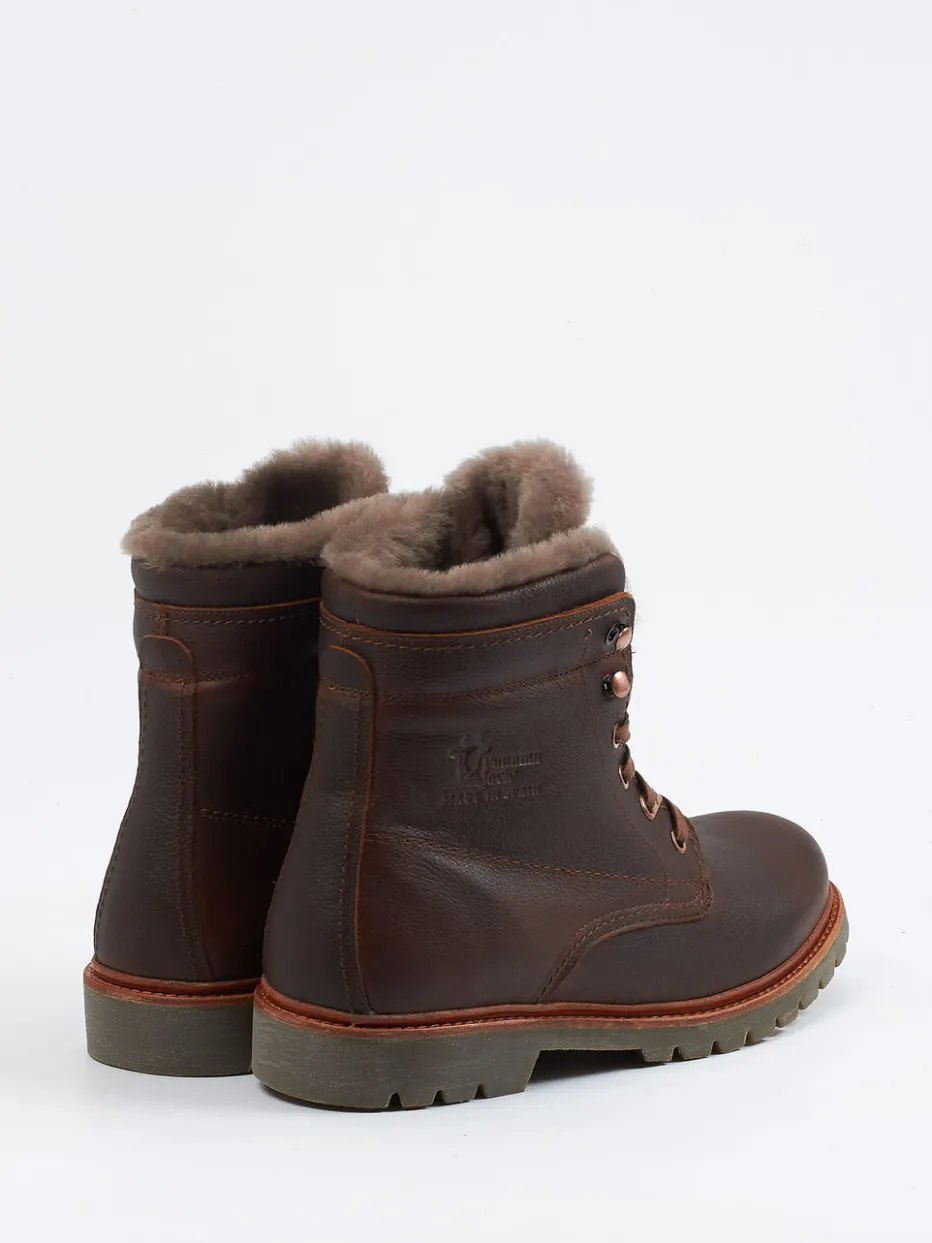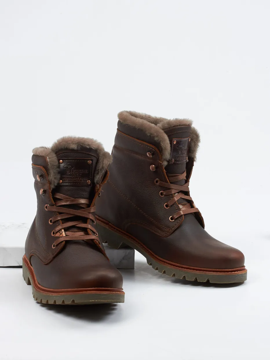 Wärmender Komfort für kalte Wintertage.Panama Jack überzeugt mit diesen gefütterten Schnürboots in der Kategorie Stiefeletten. Wenn urbaner Alltag auf winterliche Bedingungen trifft, sorgt dieses Modell für zuverlässigen Schutz und Komfort. Das braune Fettleder ist wetterfest verarbeitet und zeigt eine genarbte Oberfläche mit kupferfarbenen Ösen und markanter Kontrastnaht. Warmes Lammfellfutter schützt vor Kälte, eine profilierte Gummisohle gibt Trittsicherheit. Die klassische, knöchelhohe Form orientiert sich an Workwear-Designs mit hochwertigem Heritage-Charakter. Ideal für lässige Looks mit Thermohose oder Jeans. Panama Jack verbindet Funktionalität mit langlebigem Stilbewusstsein.