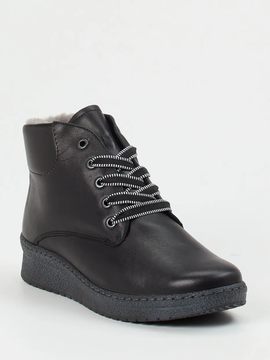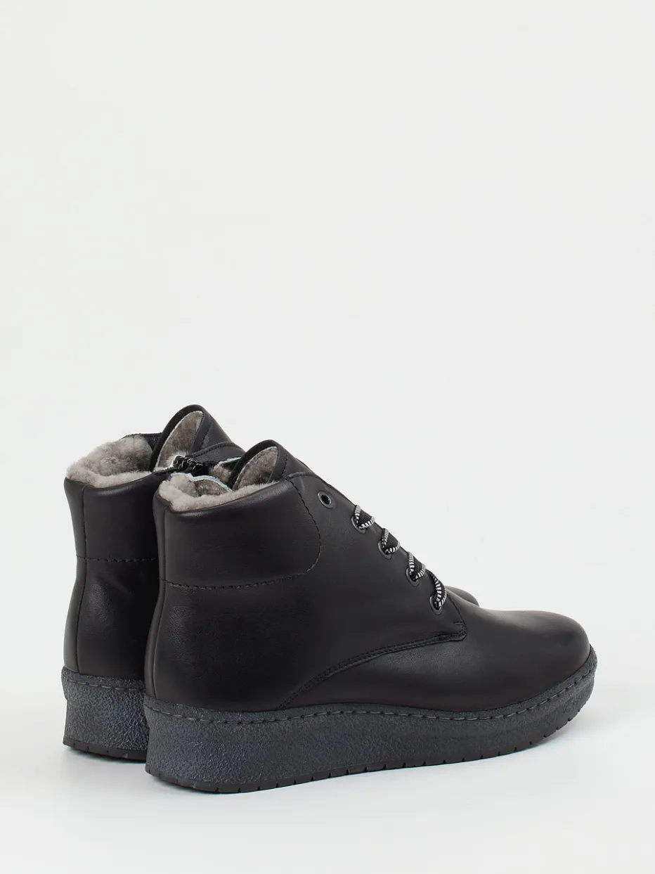 Robuster Begleiter für kalte Wintertage.Die Marke Semler präsentiert eine komfortorientierte Stiefelette mit funktionalem Anspruch. Für ausgedehnte Spaziergänge bei niedrigen Temperaturen bieten diese Damen-Stiefeletten aus mattem Kalbleder und warmem Innenfutter aus Lammfell zuverlässigen Schutz und stilvolle Optik. Das schwarze Obermaterial wird durch zweifarbige Schnürbänder, sichtbare Ziernähte und die rund zulaufende, knöchelhohe Silhouette akzentuiert. Dank Reißverschluss und Schnürung gelingt der Einstieg mühelos. Die rutschfeste Gummisohle in Krepp-Optik sowie das austauschbare Fußbett erhöhen den Tragekomfort spürbar. Passend zu Wintermode im „Quiet Luxury“-Look, etwa mit Steppjacke und Thermo-Leggings. Wärme, Halt und Bewegungsfreiheit mit markentypischem Komfortverständnis.