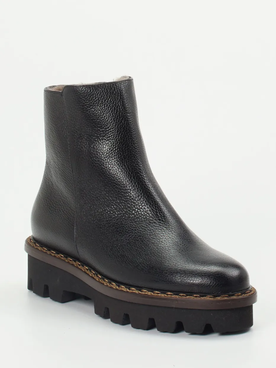 Warme Eleganz für kalte Tage.Die Damen-Stiefeletten von Mannori vereinen Komfort und Charakter. Ob beim Stadtspaziergang oder im Outdoor-Alltag – das schwarze Kalbleder zeigt sich genarbt, hochwertig verarbeitet und mit warmer Lammfellfütterung ausgestattet. Die klassisch-knöchelhohe Silhouette mit praktischem Reißverschluss sorgt für guten Halt, während die leichte Profilsohle in dunkler Holzoptik sicheren Tritt verleiht. Kontrastnähte und Streetwear-inspirierte Details ergänzen den unaufdringlich urbanen Look. Ideal kombinierbar mit Wollmantel oder legerem Casual-Styling. Mannori steht für langlebige Qualität mit stilsicherer Funktion.