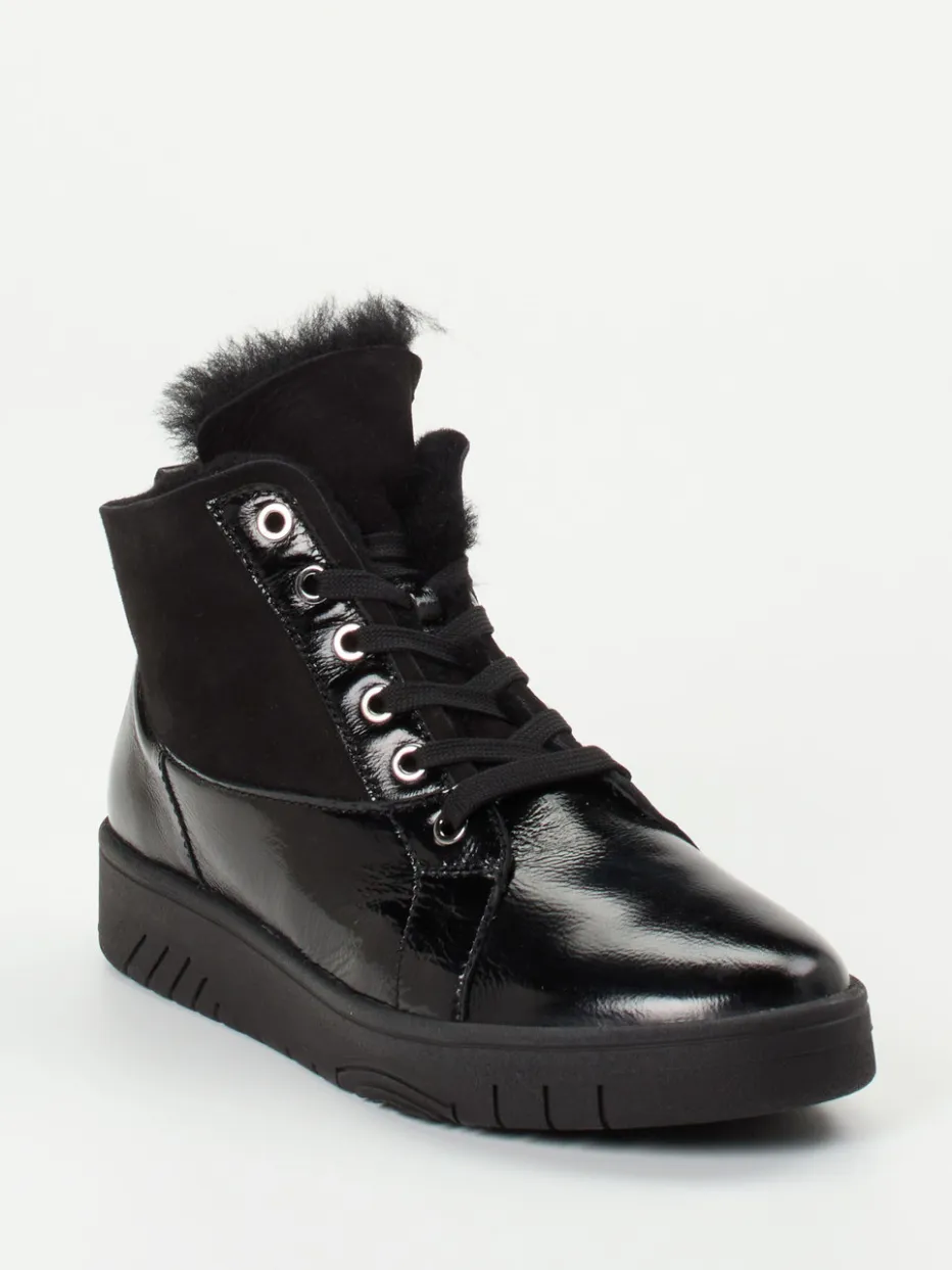 Die Kombination aus glänzendem Lackleder und weichem Velours schafft ein spannendes Finish – funktional ergänzt durch Kunstfellfutter und Wechselfußbett für orthopädische Einlagen.