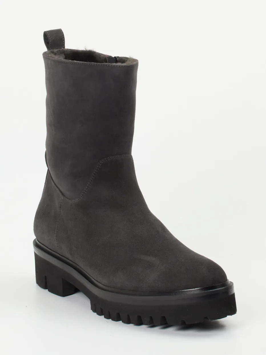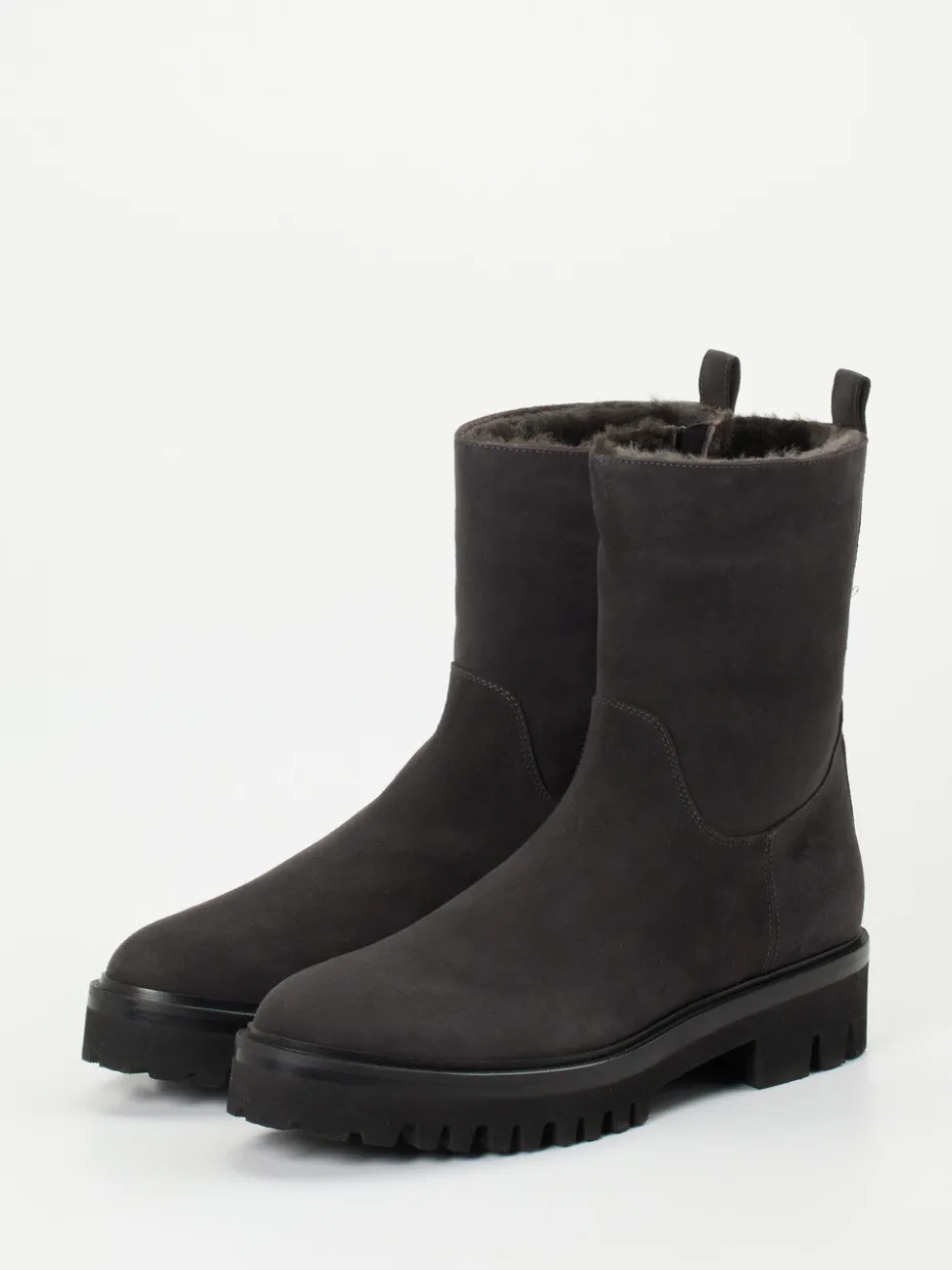 Robust. Minimalistisch. Wintertauglich.Truman’s interpretiert die klassische Winter-Stiefelette für Damen neu. Für kalte Tage bietet das Modell mit samtigem Veloursleder in Anthrazitgrau sowie flauschigem Lammfellfutter wohltuende Wärme. Die geradlinige Silhouette, der dezente Innenreißverschluss und die praktische Zuglasche hinten unterstreichen den cleanen Utility-Look. Mit rutschfester schwarzer Gummisohle und 4 cm Absatz überzeugt die Stiefelette auch funktional – ideal für Alltag und Outdoor. Das minimalistische Design reflektiert aktuelle Quiet-Luxury-Trends. Hochwertiger Komfort trifft auf stilvolle Alltagstauglichkeit – typisch Truman’s.