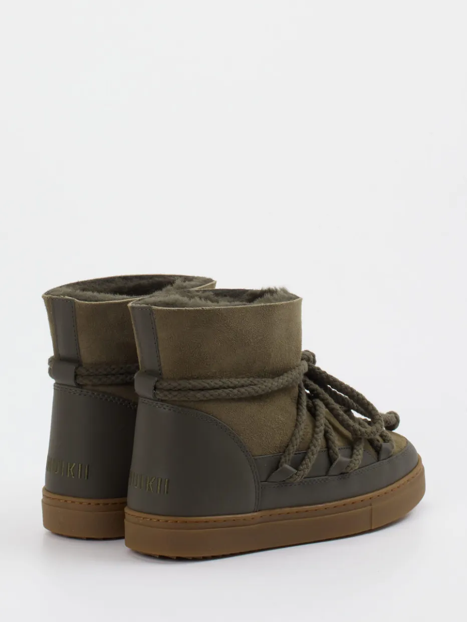 Robuster Winterstil mit Komfortfaktor.Inuikii präsentiert mit diesen Stiefeletten ein modisches Highlight für die kalte Jahreszeit. Mit ihrer olivgrün-matten Farbgebung, dem knöchelhohen Schaft und der markanten Kordelschnürung bieten sie urbanes Outdoor-Flair mit klarer Scandi-Ästhetik. Das hochwertige Velour/Leder-Mix-Obermaterial zeigt sich samtig strukturiert, kombiniert mit einer robust profilierten Gummisohle. Ein warmes Innenfutter aus Lammfell und ein praktisches Schnürsystem sorgen für Tragekomfort bei winterlichen Bedingungen. Im Trendkontext passen sie zur „Gorpcore“-Bewegung und setzen ein Statement für funktionalen Stil. Inuikii steht hier für langlebige Materialien, durchdachte Details und unverkennbares Design.