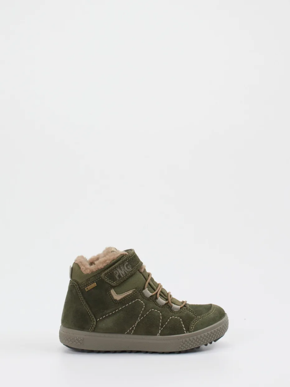 Wärme und Halt für kleine Entdecker.Primigi präsentiert praktische Stiefeletten für Kinder mit hochwertigen Outdooreigenschaften. Ob auf dem Schulweg oder beim Toben im Wald – die gefütterten Boots aus Veloursleder zeigen sich strapazierfähig und komfortabel zugleich. Das matte Obermaterial erhält durch Kontrastnähte und eine Logo-Stickerei auf dem Klettverschluss einen sportlichen Akzent. Dank Warmfutter und rutschfester Gummisohle sind sie wie gemacht für kalte, nasse Tage. Der olivgrüne Ton fügt sich vielseitig in Freizeit- und Outdoor-Outfits ein. Ein Modell, das funktionale Wetterfestigkeit und kindgerechtes Design stilvoll vereint.