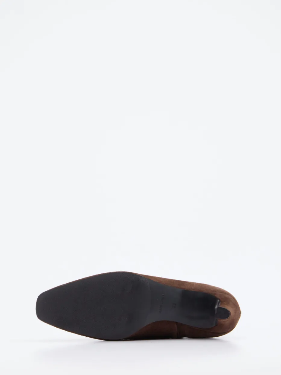 Für stilvolle Büro-Outfits und abendliche Events ist das Modell aus hochwertigem Veloursleder, samtig-matt strukturiert, besonders geeignet. In sattem Schokobraun gehalten, besticht die taillierte Form durch die spitz zulaufende Front und den 5 cm hohen Kitten Heel. Der Ton-in-Ton gehaltene Innenreißverschluss unterstreicht den minimalistischen Ansatz, während die rutschhemmende Gummisohle Funktionalität verleiht. Das dezente Design folgt dem Retro-Trend der 90er und passt ideal zu einem Kaschmirmantel.