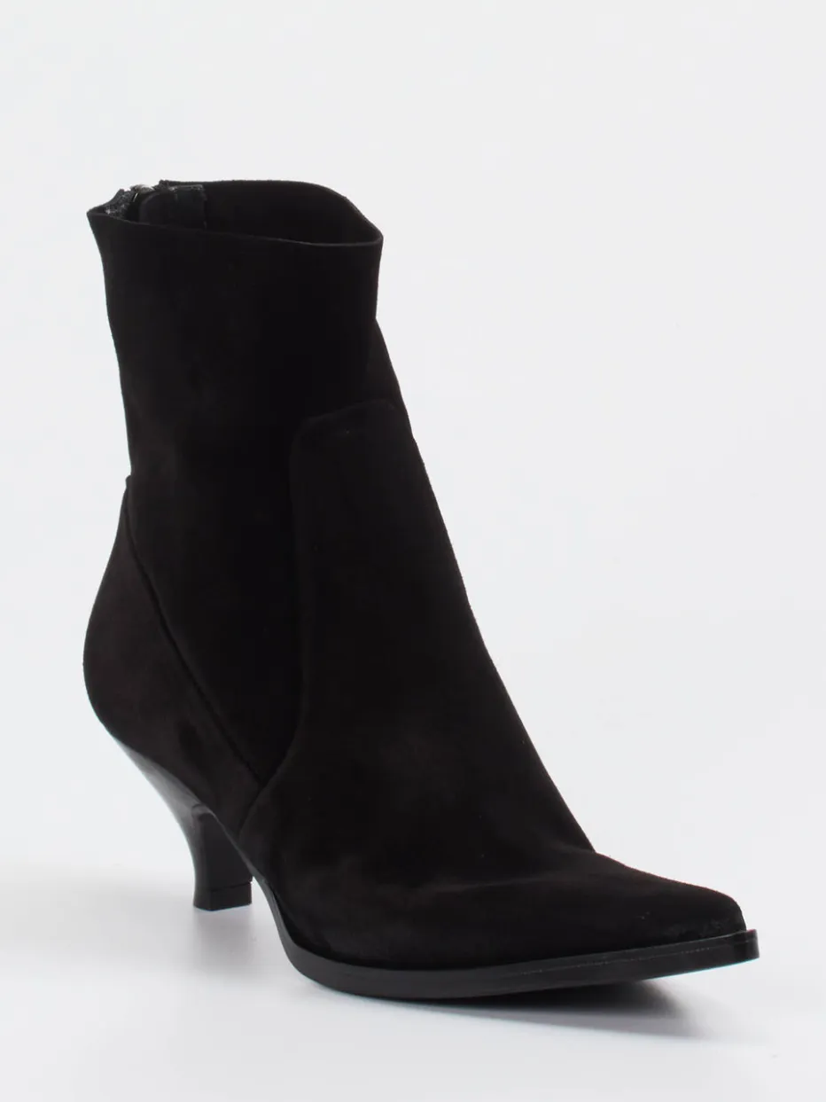 Die elegante Kitten-Heel-Stiefelette von Elena Iachi verbindet minimalistische Linienführung mit hochwertigem Veloursleder – ein Design, das sich klar am Quiet Luxury orientiert.