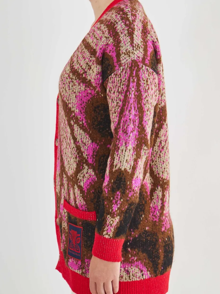 Die Oversized-Strickjacke kombiniert weichen Baumwoll-Alpaka-Mix mit expressivem Ethno-Muster und farbintensiven Kontrasten. Ideal für kunstvolle Layering-Looks im Alltag.