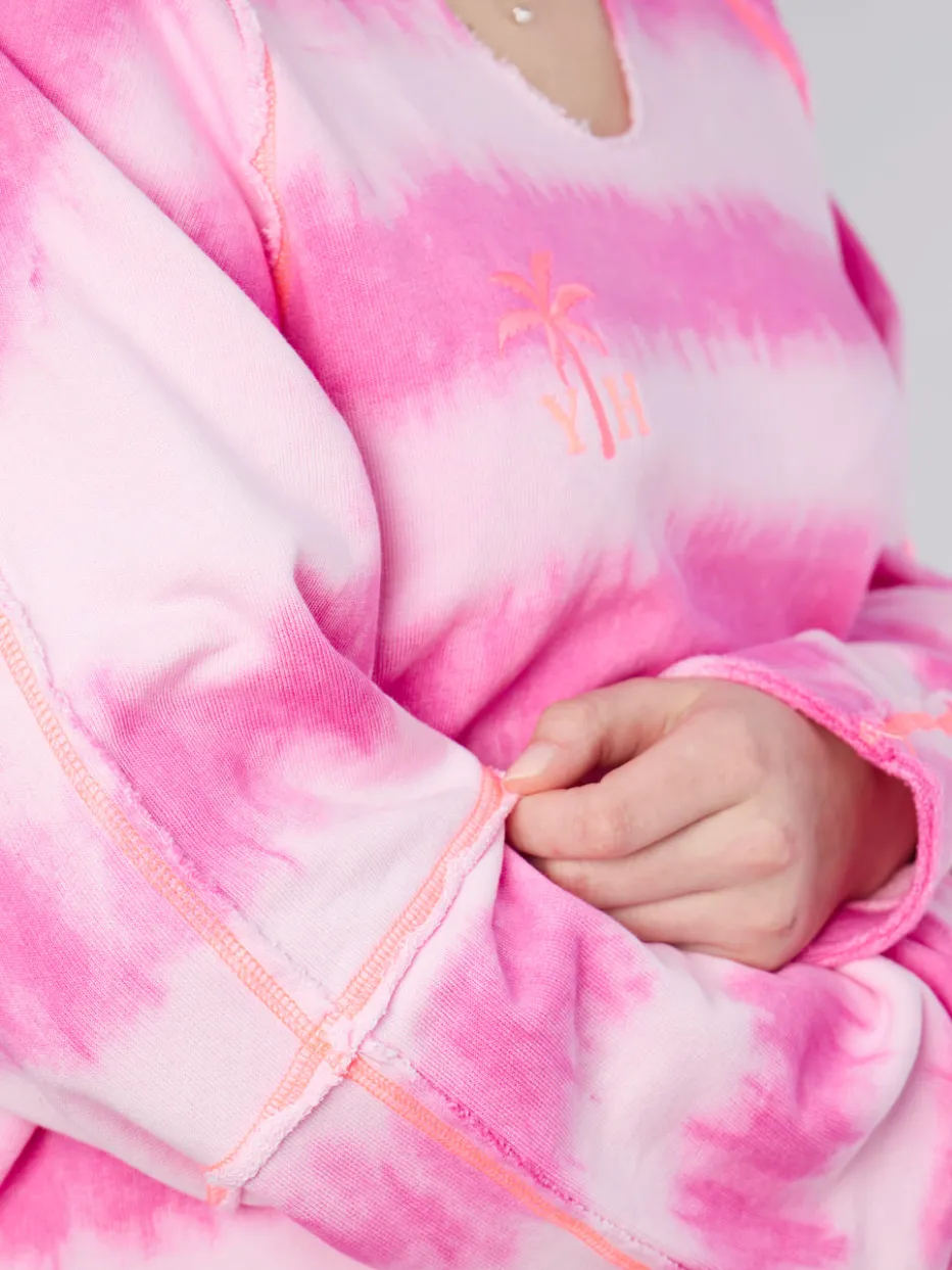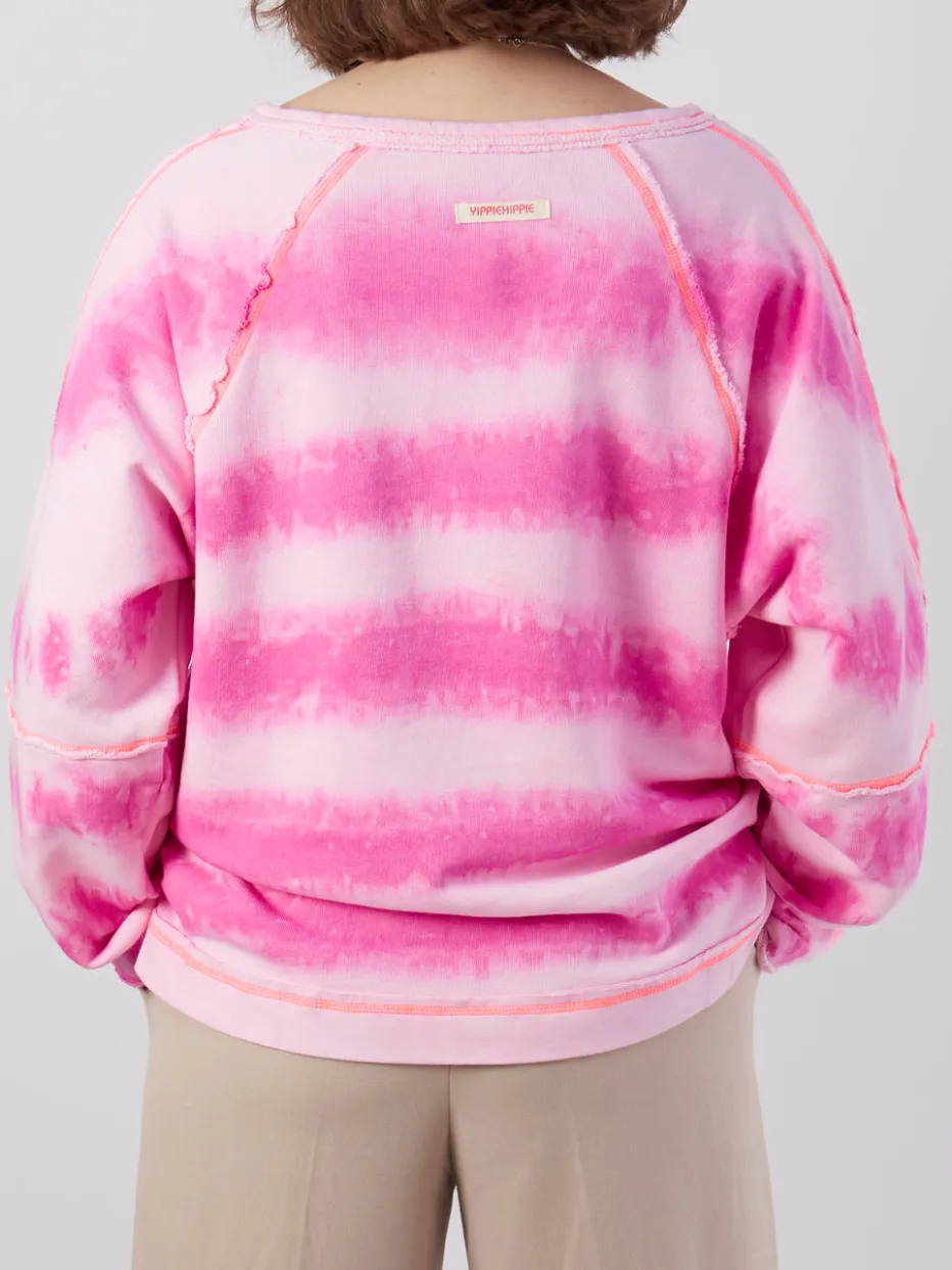 Der lockere Schnitt, der sommerliche Batik-Look und verspielte Details machen dieses Sweatshirt zu einem Statement-Piece für trendbewusste Freizeit-Outfits.