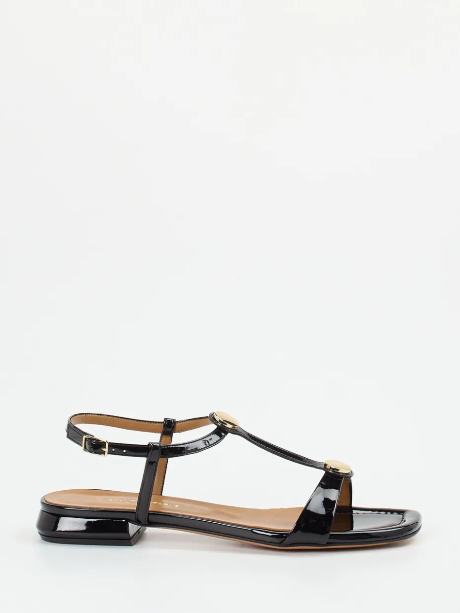 Diese Sandale vereint hochglänzendes Lackleder mit eleganten Goldakzenten – ein stilvolles Highlight im Zeichen des Quiet Luxury. Die flache Form und dezente Carré-Leiste runden das Design urban ab.
