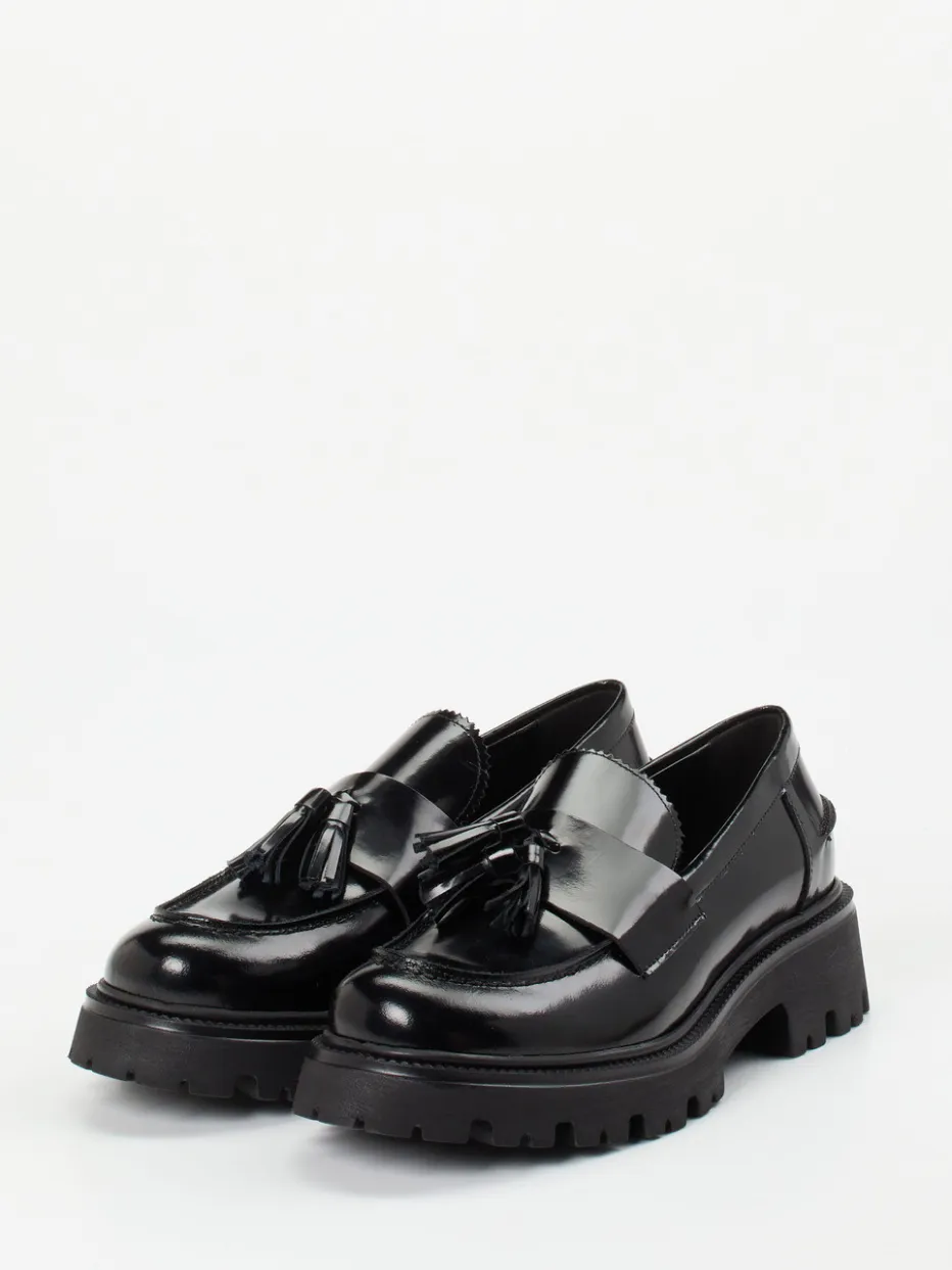 Klassisch und modern zugleich: Der Loafer aus schwarzem Hochglanzleder verbindet elegante Preppy-Ästhetik mit dem Trend der Chunky-Sohle.