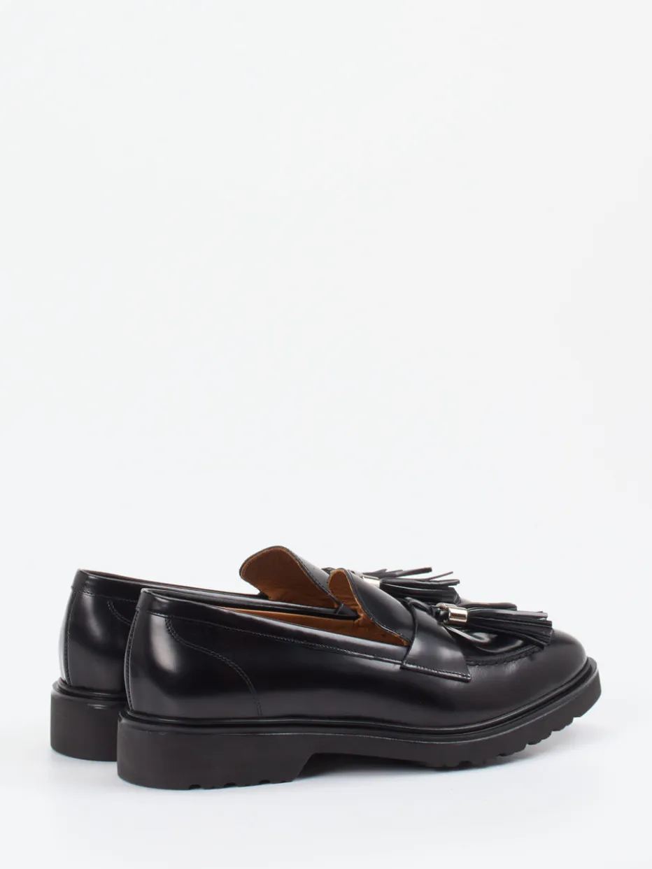 Dieser Tassel Loafer aus schwarzem, glänzendem Kalbleder verbindet klassische Form mit modernem Chunky-Trend. Wertige Details wie Quasten und profilierte Sohle prägen sein stilvolles Erscheinungsbild.