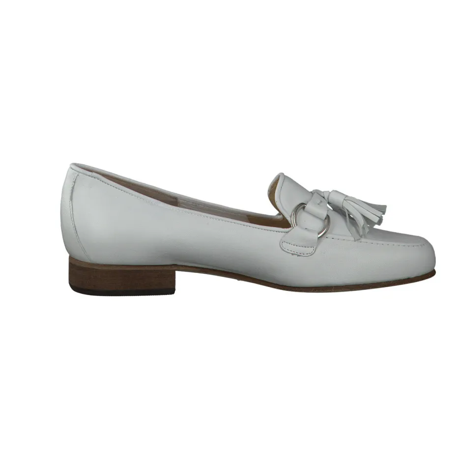 Edel sieht dieser sommerliche Slipper von Mannori aus. Das weiße Nappaleder ist samtig weich, es ist in den seitlichen Bereichen ungefüttert. Besonders attraktiv ist die handwerkliche Bride. Sie besticht durch die silberfarbenen Accessoires, den offenkantigen Riegel und die sportlichen Tasseln. Die Carréform hat eine gute Passform. Angenehm ist auch die leichte Innenpolsterung der Ledersohle. Einen farblichen Akzent setzt der dunkelnaturfarbene Ausputz des Absatzes und der Sohle.