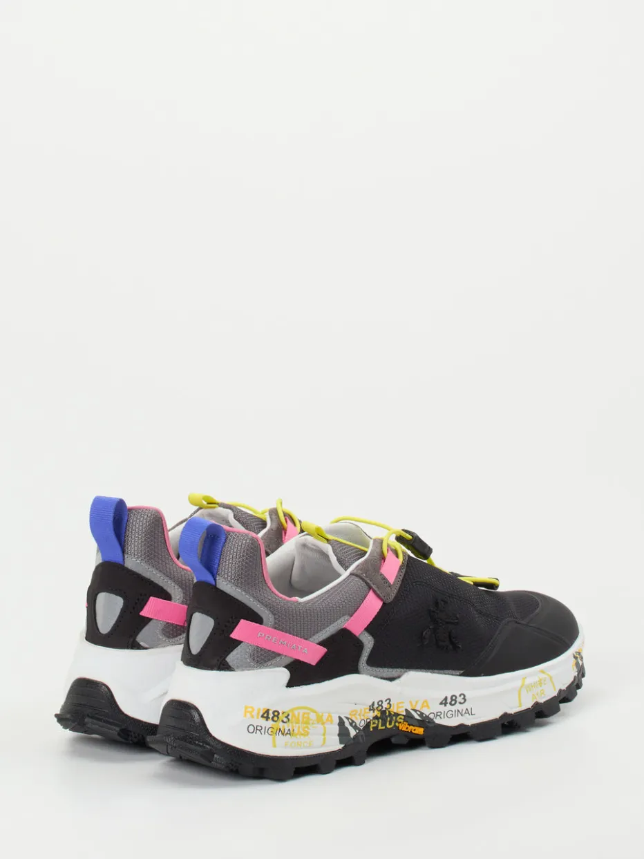 Gorpcore trifft auf Fashion-Aussage.Die Marke Premiata interpretiert den Trail-Sneaker im Streetwear-Stil neu. Robuste Gummisohle, herausnehmbares Lederfußbett und atmungsaktives Textil – dieses Modell verbindet Komfort mit visuell markanter Designsprache. Der schwarze Grundton wird durch neongelbe und pinkfarbene Details unterbrochen, ergänzt um eine veilchenblaue Fersenzuglasche. Die bedruckte Zwischensohle und das Schnellschnürsystem unterstreichen den sportlich-progressiven Charakter. Ideal für urbane Freizeit-Looks oder als kontraststarker Akzent zum Outdoor-Style. Mit ergonomischer Linienführung und griffiger Vibram-Sohle steht Premiata hier für urbanen Designkomfort.