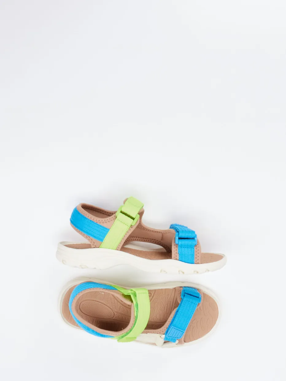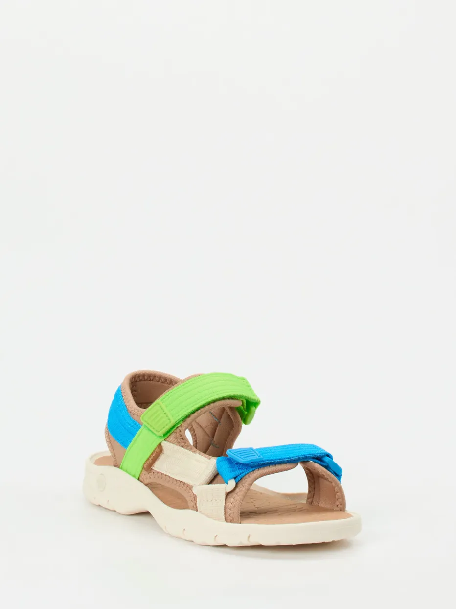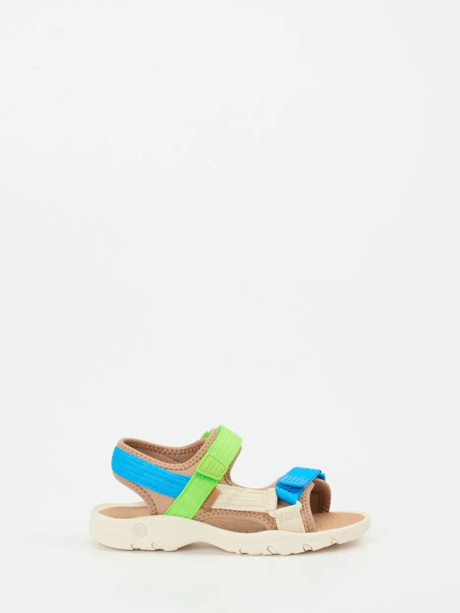 Ideal für aktive Sommertage bietet das Modell verstellbare Klettverschlüsse, die das An- und Ausziehen erleichtern und eine individuelle Passform ermöglichen. Der bequeme Textilschaft in Beige wird durch fröhlich kontrastierende Riemen in Himmelblau, Neongrün und Weiß ergänzt. Die ergonomisch geformte und gepolsterte Innensohle sowie eine strukturierte, rutschfeste Gummilaufsohle bieten optimale Trittsicherheit. Durch die offene, luftige Silhouette eignet sich die Sandale perfekt für Freizeit, Spielen im Freien oder kleine Wanderungen. Lässig kombinierbar mit Shorts und UV-Shirt.