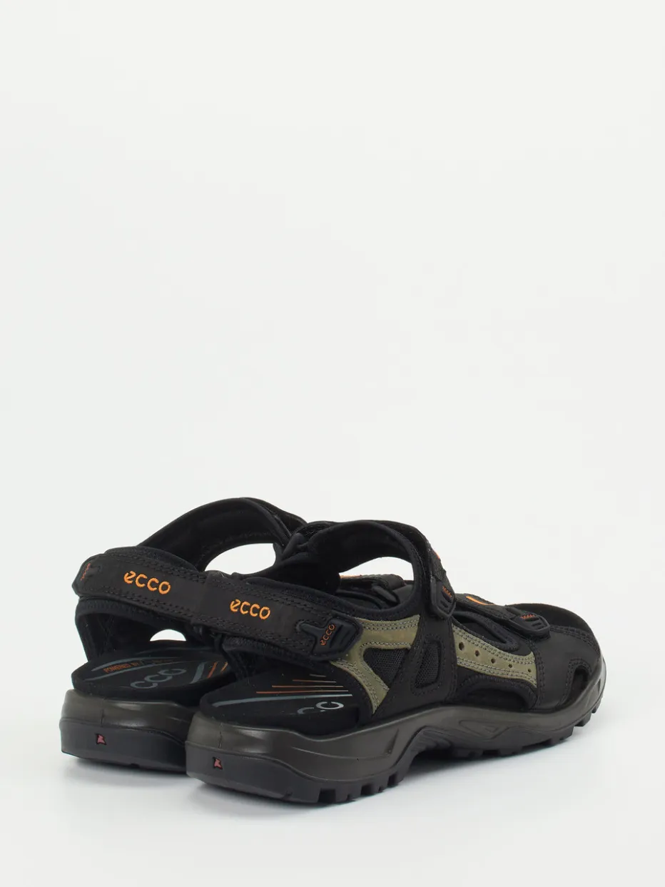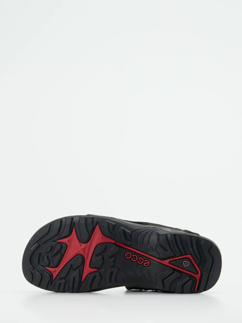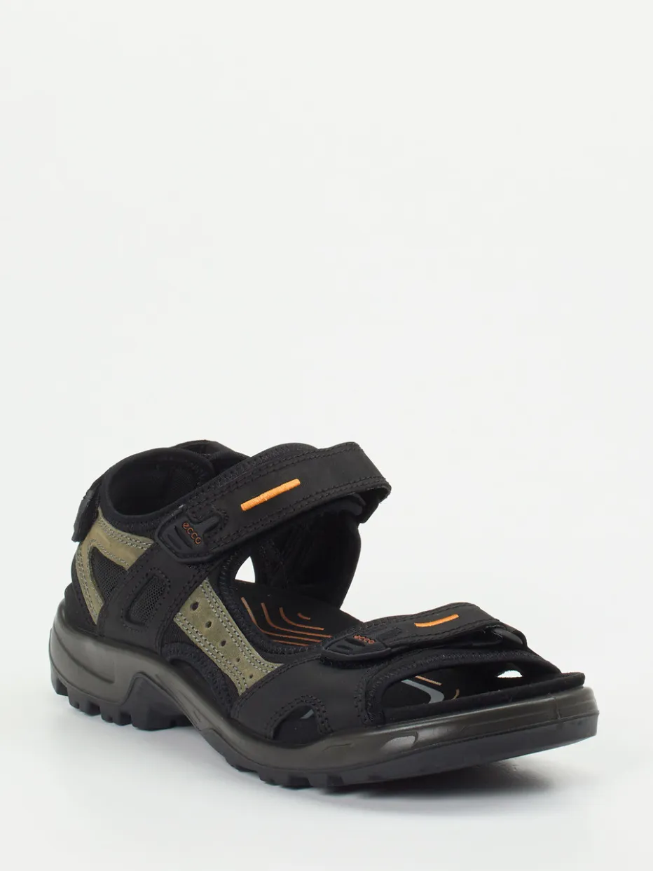 Performance trifft Komfort in der Natur.Ecco präsentiert mit dieser Trekking-Sandale für Herren ein funktionales Modell für aktive Tage. Ideal für Wanderungen bei warmem Wetter bietet die offene, ergonomisch geformte Silhouette mit drei Klettverschlüssen individuellen Halt. Das Material aus Textil zeigt sich in mattem Schwarz mit olivgrünen Elementen, ergänzt durch atmungsaktive Mesh-Einsätze und ein weiches Neoprenfutter. Orangefarbene Kontrastdetails und Logo-Prints setzen sportliche Akzente im Gorpcore-Stil. Die rutschhemmende Gummisohle mit markanter Profilierung sorgt für Trittsicherheit. Lässt sich ideal mit Funktionsshorts und Outdoor-Rucksack kombinieren. Höchster Gehkomfort durch Receptor®-Technologie und markentypisches Designverständnis.