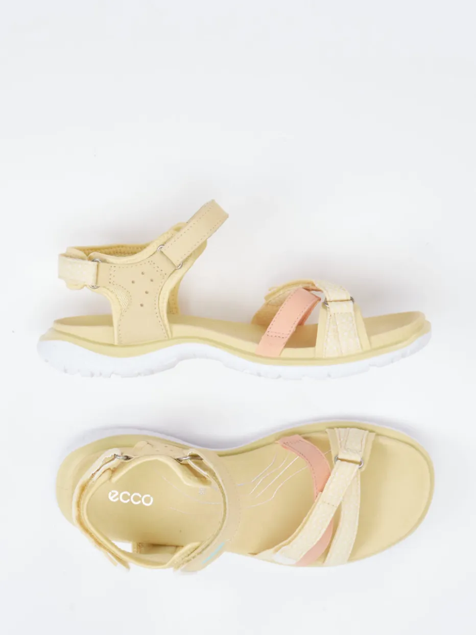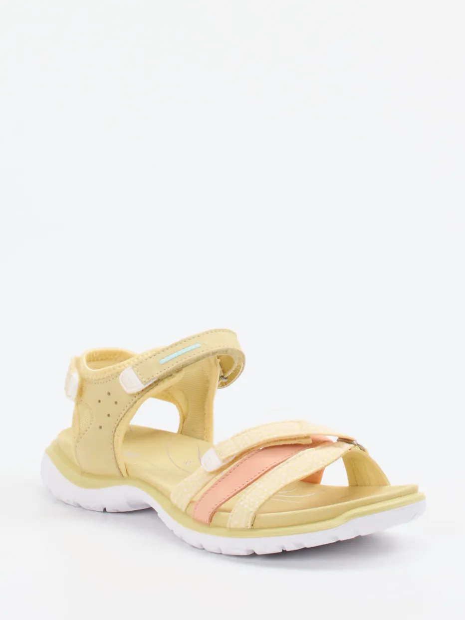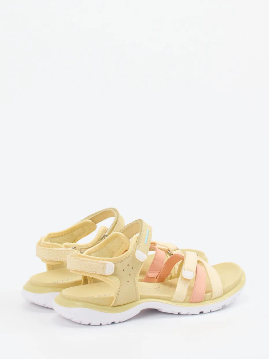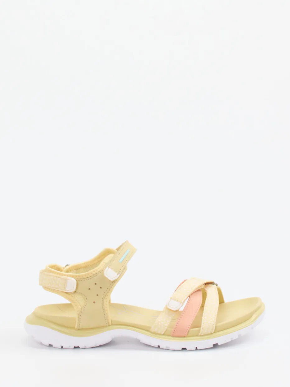 Komfort trifft sommerliche Outdoor-Leichtigkeit.Die Marke Ecco präsentiert mit dieser Trekkingsandale eine vielseitige Damen-Sandale für aktive Tage. Ideal für Spaziergänge im Urlaub oder urbane Abenteuer: Das Obermaterial aus Nubukleder und Synthetik ist strapazierfähig und samtig angeschliffen, kombiniert mit einer pastellgelben Farbgebung und pfirsichrosa Akzenten. Weiße Klettverschlüsse sorgen für flexible Anpassung, das ergonomische Fußbett und die profilierte Gummisohle bieten Stabilität bei jedem Schritt. Die offene, ergonomische Silhouette und dezente Logo-Prägung greifen den aktuellen Gorpcore-Trend stilvoll auf. Perfekt zu Shorts oder Funktionsoutfits kombinierbar. Verbindet skandinavisches Design mit markentypischem Gehkomfort.