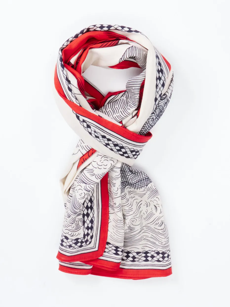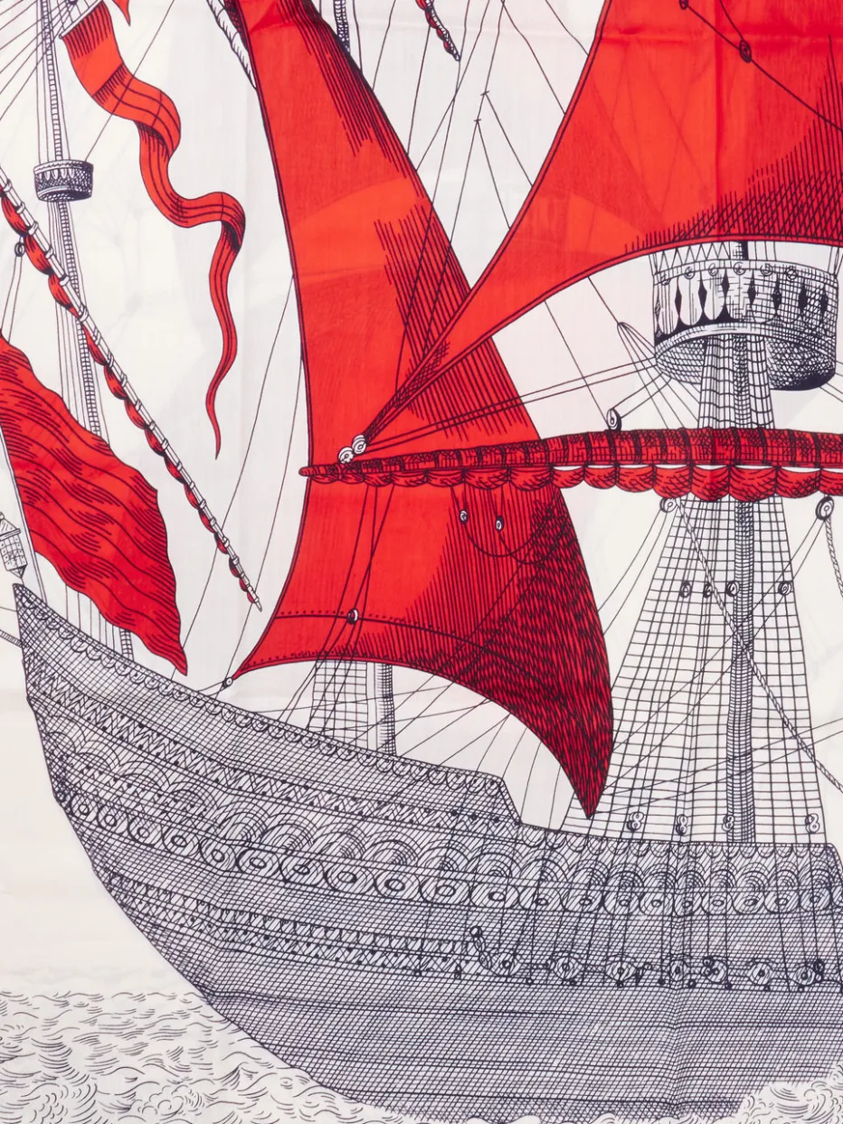 Dieses quadratische Tuch kombiniert edle Baumwolle-Seide-Qualität mit einem kunstvollen Segelschiff-Motiv und verkörpert französisch-elegante Vintage-Ästhetik.