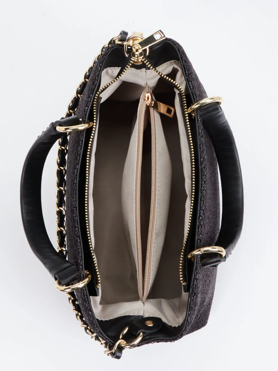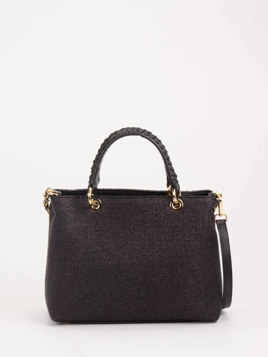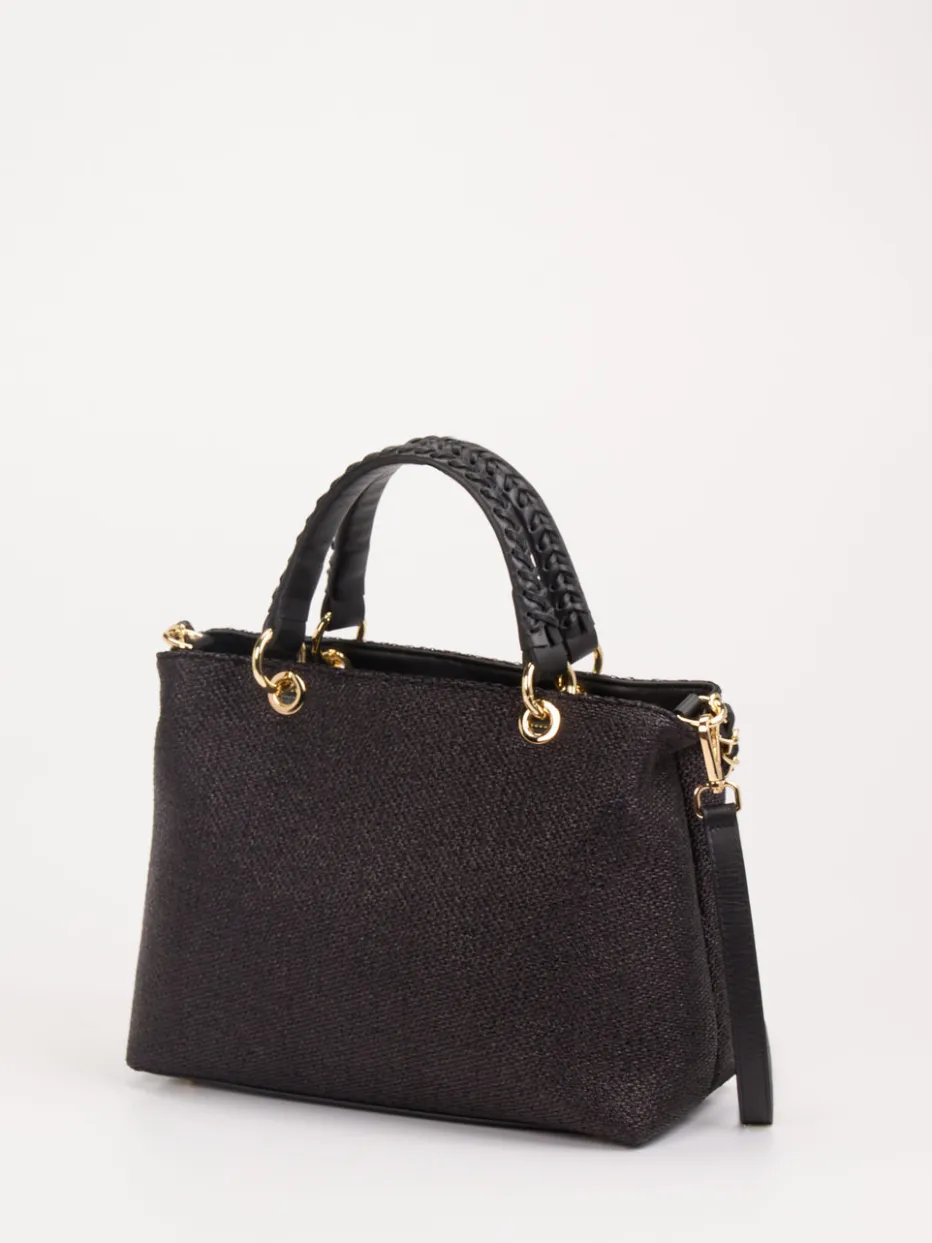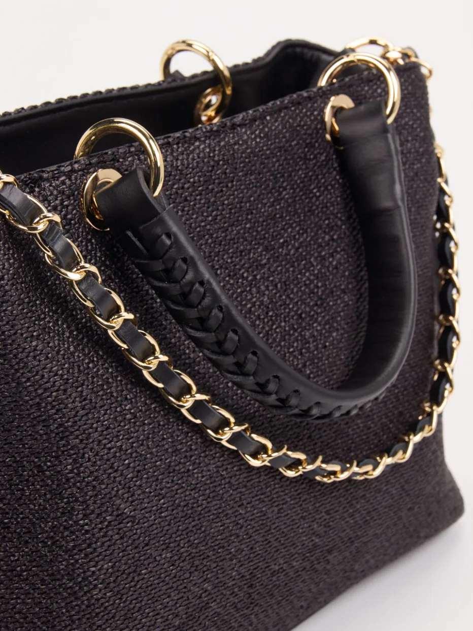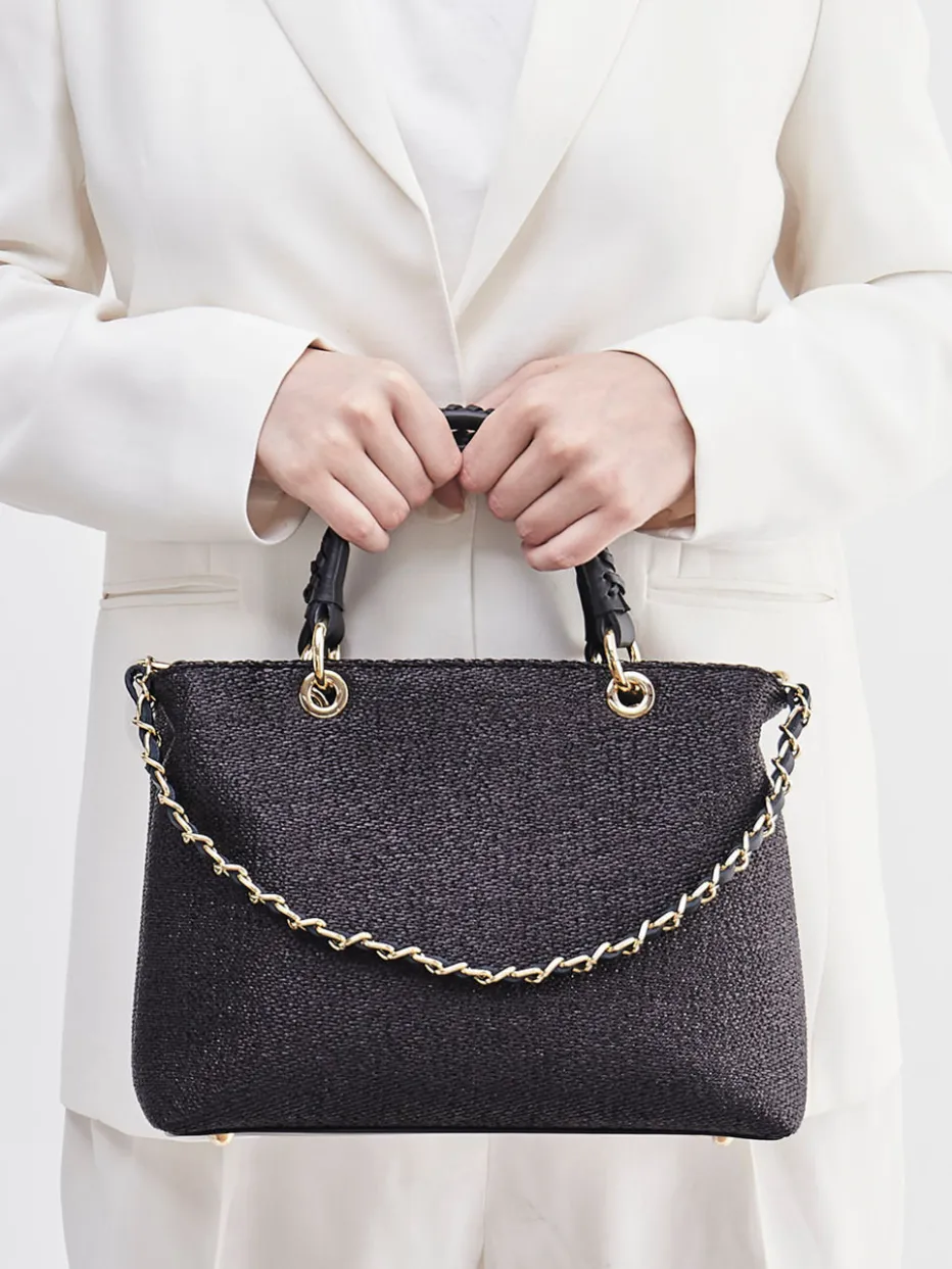 Edel, feminin und extravagant designt für Ihren Alltag! Diese schwarze Umhängetasche von Konstantin Starke ist ein stilvoller Begleiter für viele Anlässe. Das Obermaterial in Bast-Optik wird mit schwarzen Lederriemen und Henkeln hochwertig kombiniert. Mit den hochglänzenden, goldfarbenen Kettenelementen und Karabinerhaken erhält die Tasche einen Hauch von Glamour. Mit dem abnehmbaren Tragegurt lässt sich die Tasche auch bequem über die Schulter hängen. Das Innere ist großzügig unterteilt. Von der Geldbörse bis zur Kosmetiktasche: hier findet alles seinen Platz. Konstantin Starke designt Taschen zum Verlieben! – Maße: ca. 23x30x10cm(HxBxT) – Farbe: schwarz – Henkel: ca. 30cm – Tragegurt: max. ca. 110cm (abnehm-und verstellbar) – Verschluss: Reißverschluss – Innen: 2 Steckfächer, 2 Reißverschlussfächer