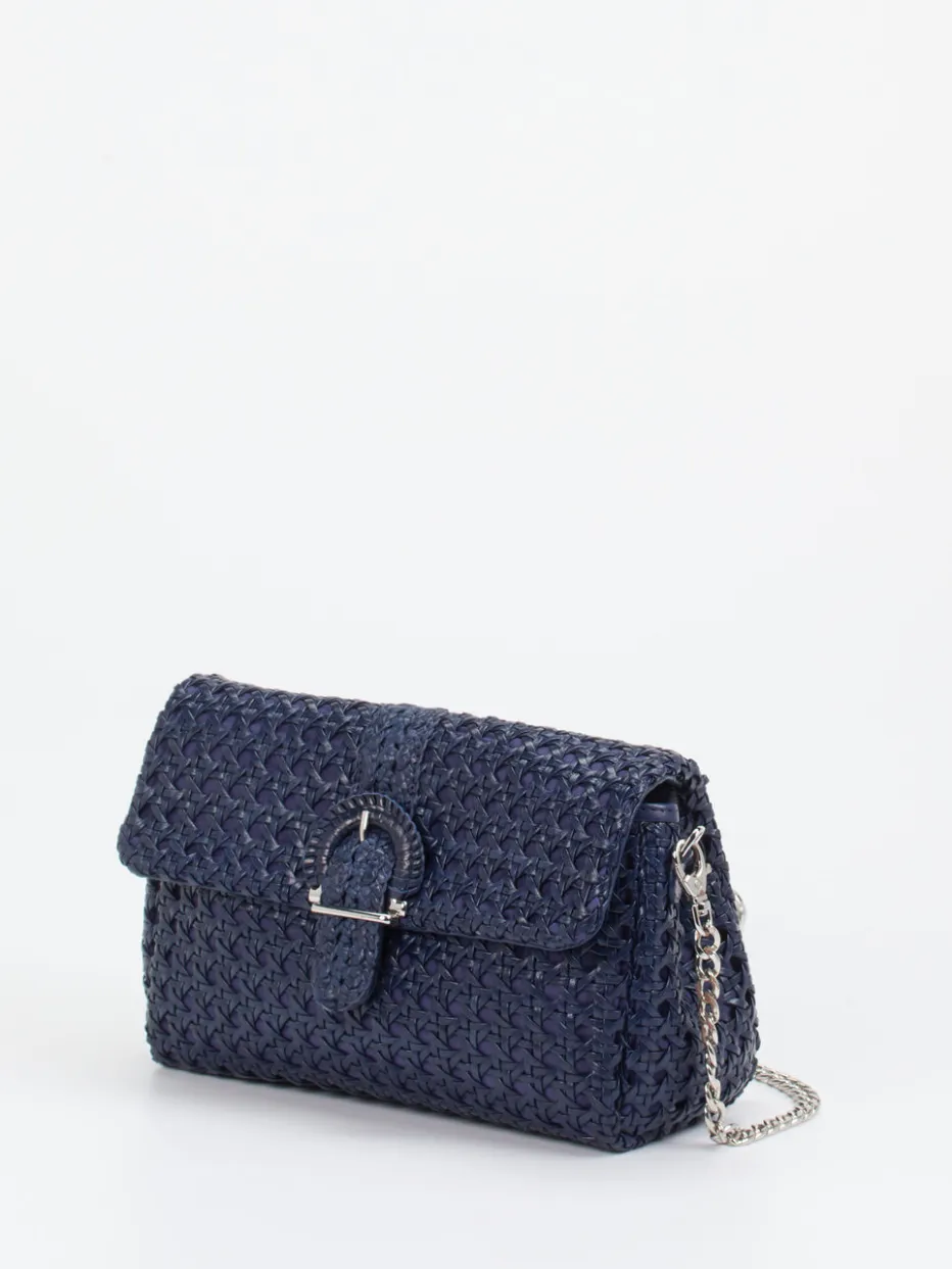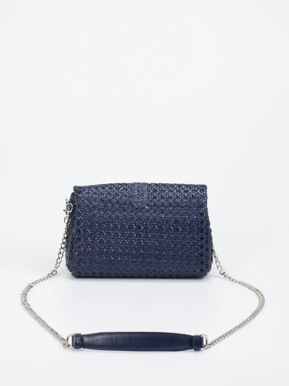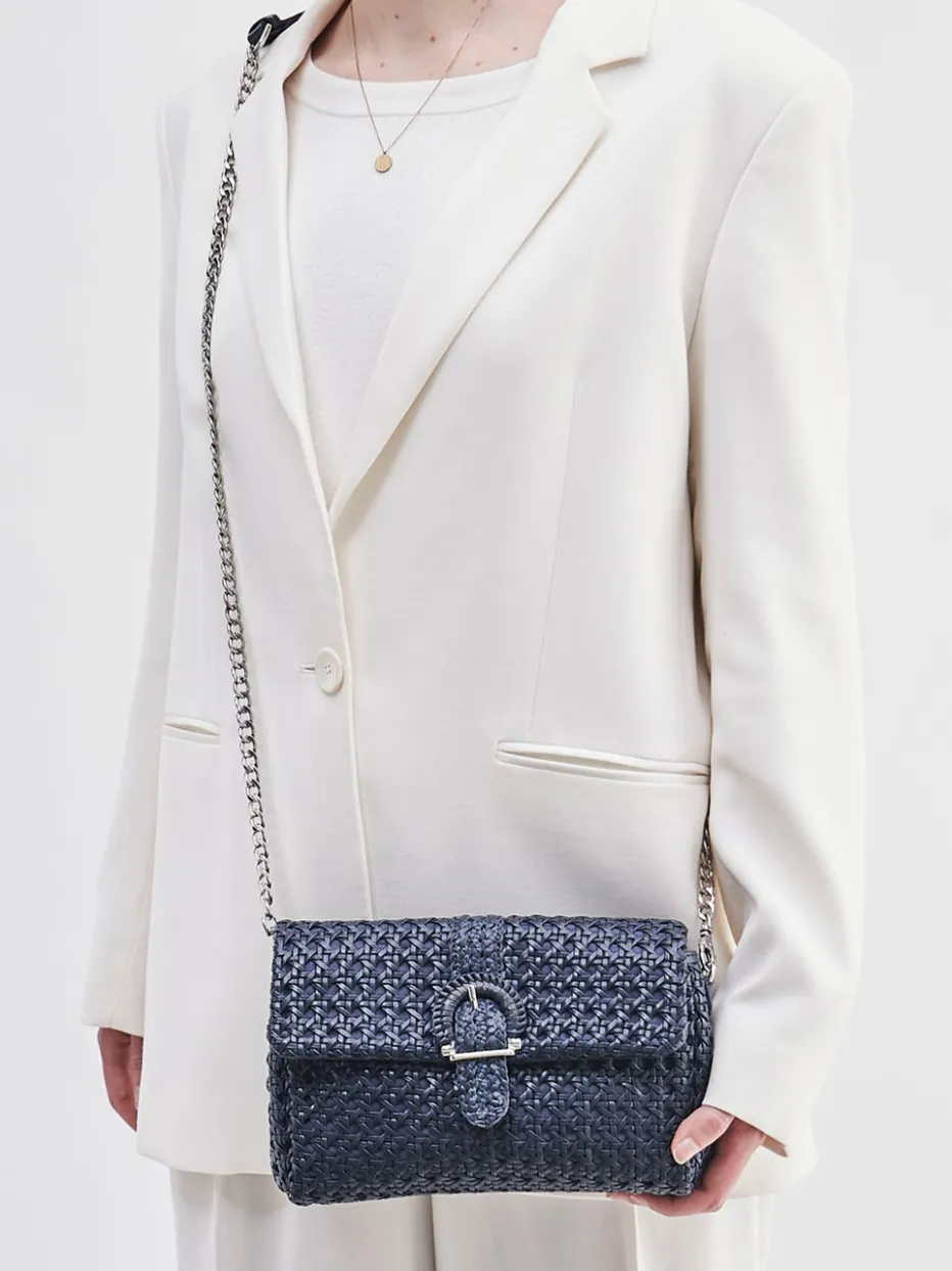 Die kunstvolle Flechtstruktur und die silberfarbene Gliederkette verleihen dieser dunkelblauen Crossbody-Tasche eine elegante Note mit Vintage-Anklang.