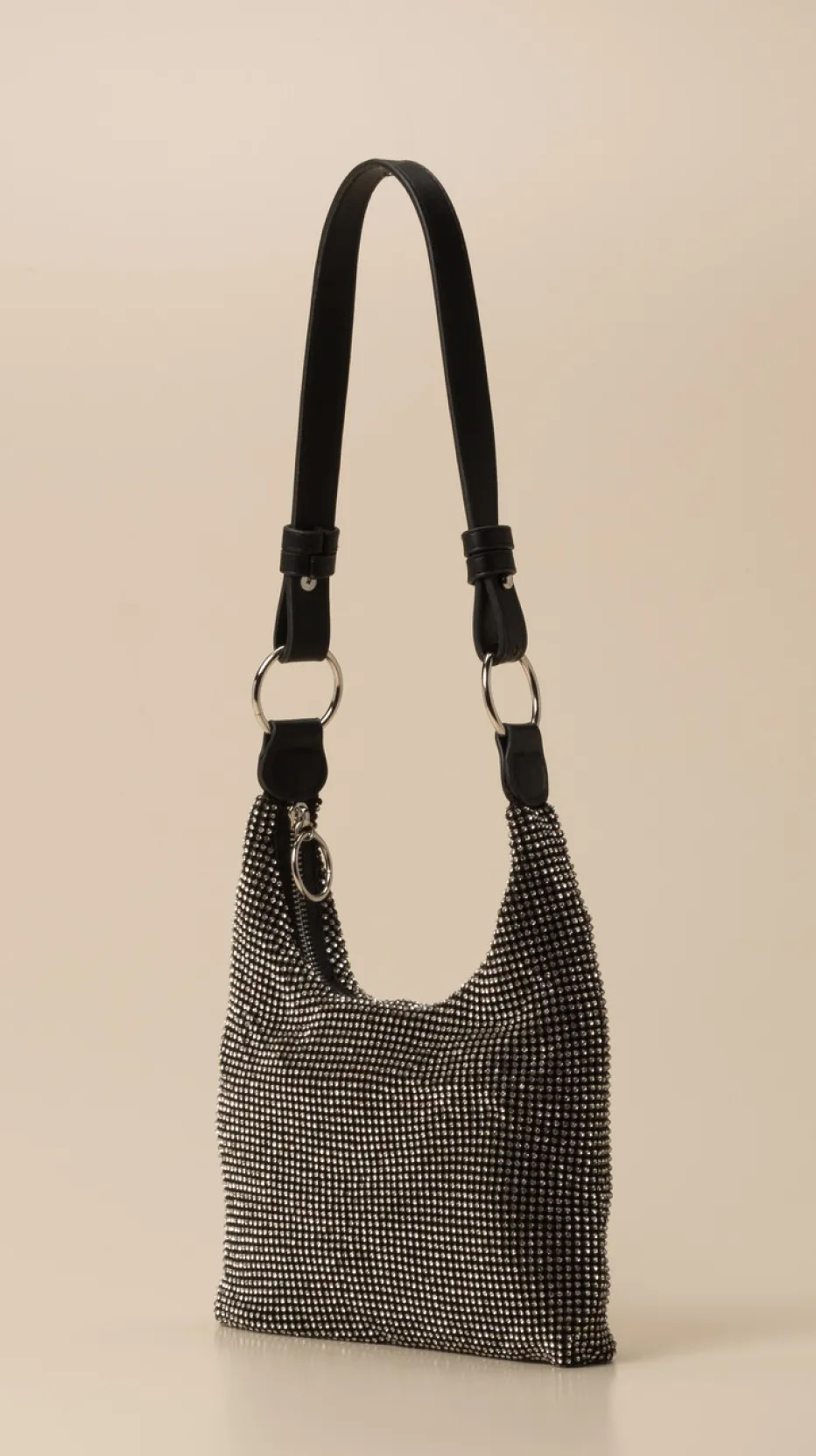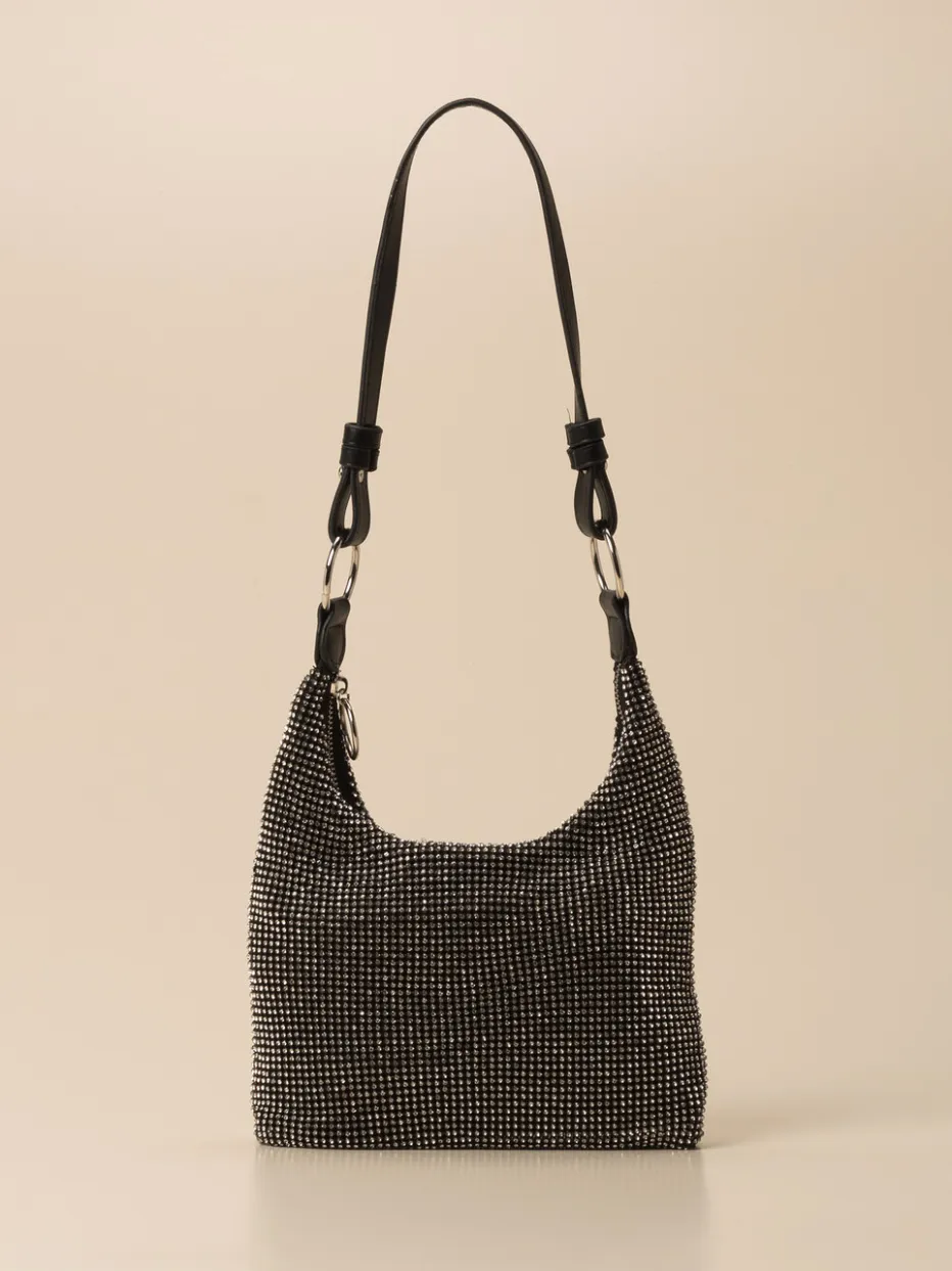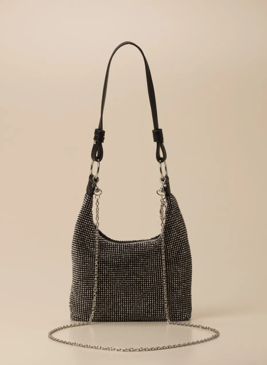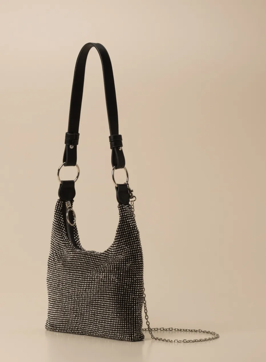 Diese glamouröse Schultertasche überzeugt mit funkelndem Strassbesatz und bietet durch zwei Tragevarianten vielseitige Stylingoptionen.