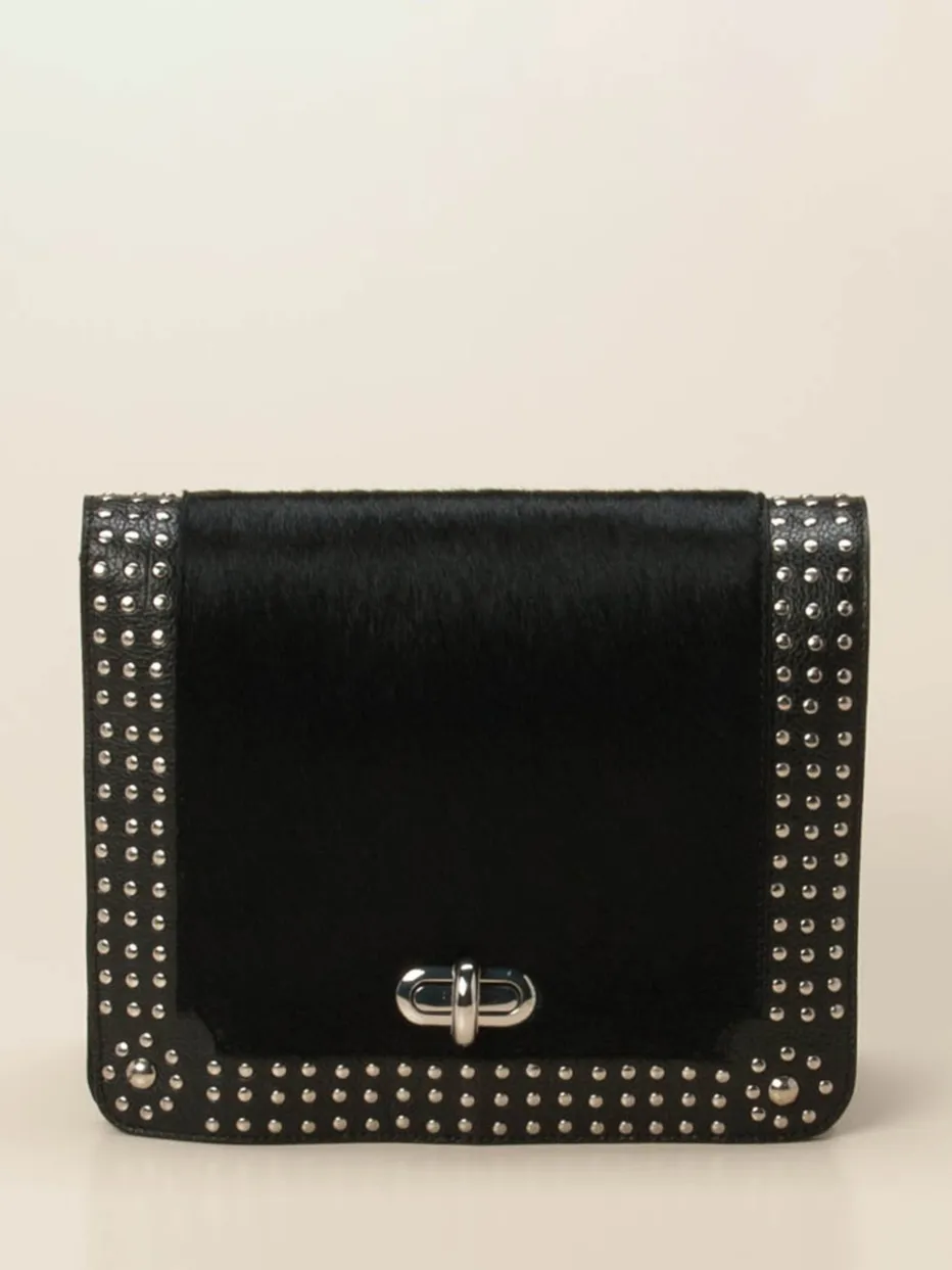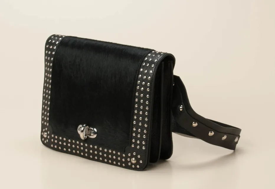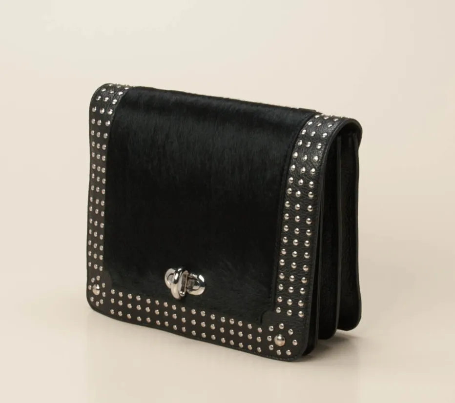 Mit strukturiertem Kalbleder, Ponyfell-Besatz und silberfarbenen Nieten vereint diese Crossbody Bag stilvolle Eleganz mit rockigem Charme. Perfekt für trendorientierte Alltags- und Party-Outfits.