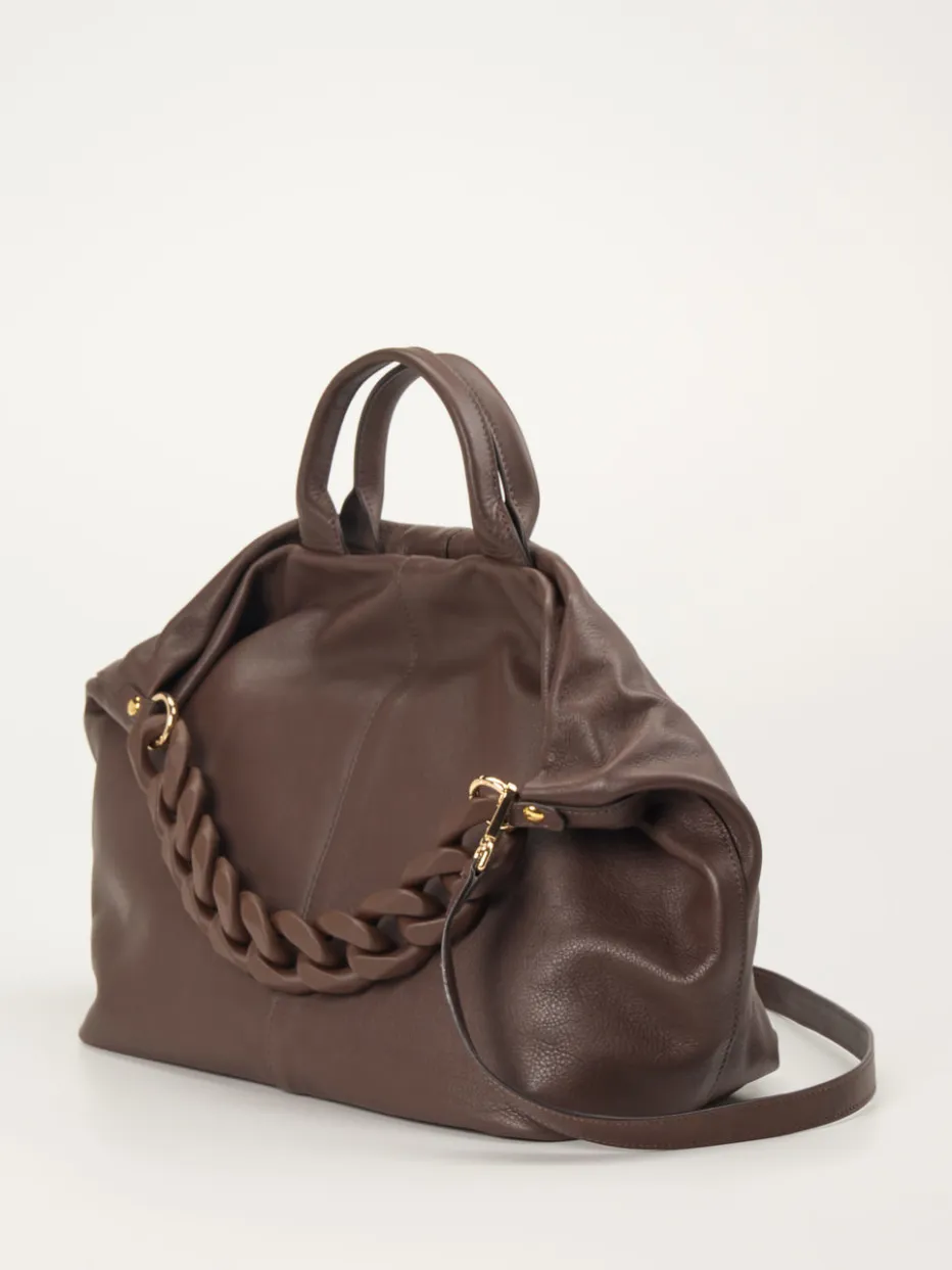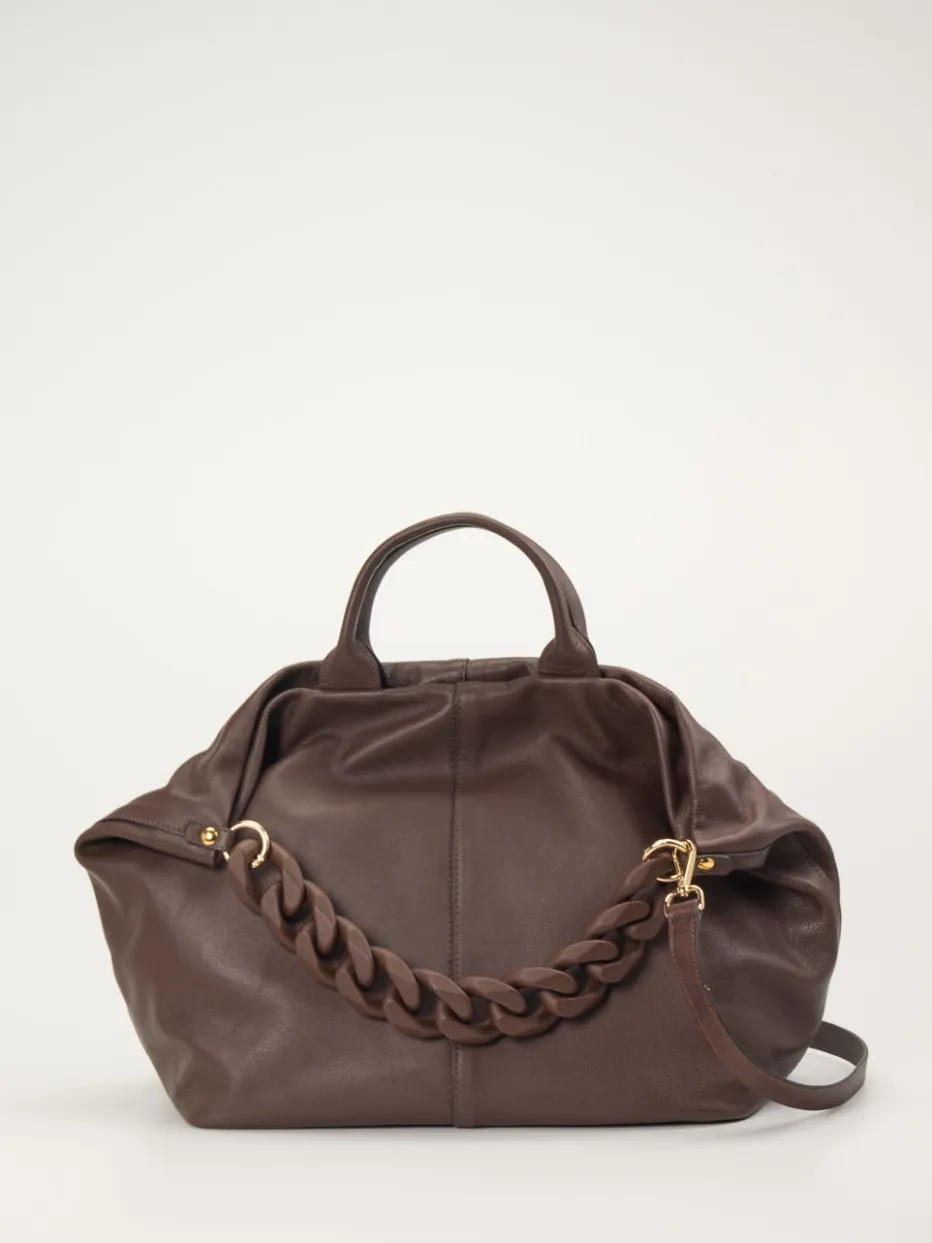 Hochwertig und in einem intensiven Farbton präsentiert die Marke Konstantin Starke diese modische Umhängetasche. Das dunkelbraune Kalbleder kommt durch die feine Narbung und die strukturgebenden Nähte wertig zur Geltung. Ein Hingucker ist der breite Kettenriemen, welcher zusammen mit den goldfarbenen Elementen moderne Akzente setzt. – Obermaterial: Kalbleder – Futter: Textil – Farbe: braun – Größe: 30 x 44 x 18 cm (H x B x T) – Henkel: ca. 30 cm – Riemen Kette: Länge ca. 40 cm, abnehmbar – Schulterriemen: max. Länge ca. 136, verstell- und abnehmbar – Verschluss: Reißverschluss – Innen: zwei Steckfächer, ein Reißverschlussfach